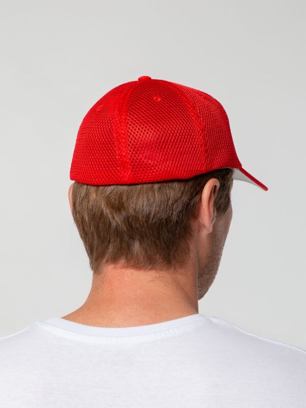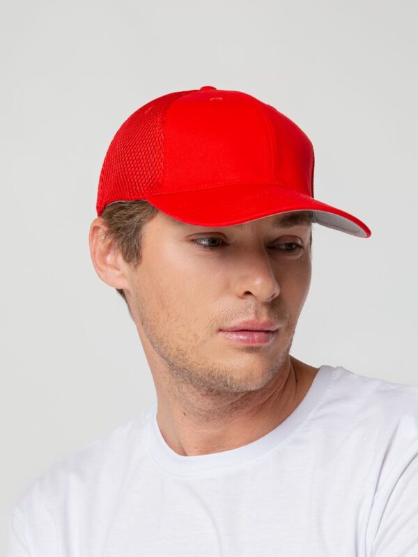 - Однотонная бейсболка из двух видов ткани: козырек и лобовые клинья из гладкого полотна, клинья на боках и на тыльной стороне из спортивной сетки