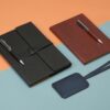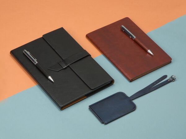 Бизнес-блокнот формата А5 в твердой обложке из искусственной кожи с ручкой в тон станет отличным подарком для любого клиента. Блокнот состоит из обложки с клапаном и сменного блока с линованными страницами.
