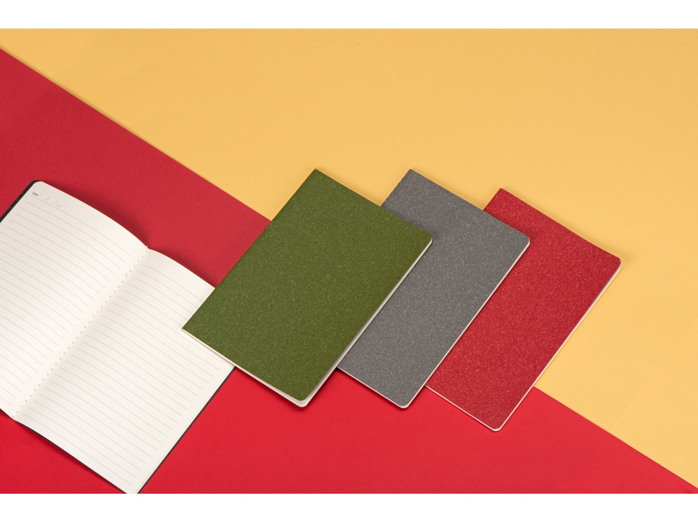 Универсальный блокнот в трендовых оттенках. Обложка матового цвета с эффектом «меланж». Прошитый нитками блок на 60 линованных страниц.