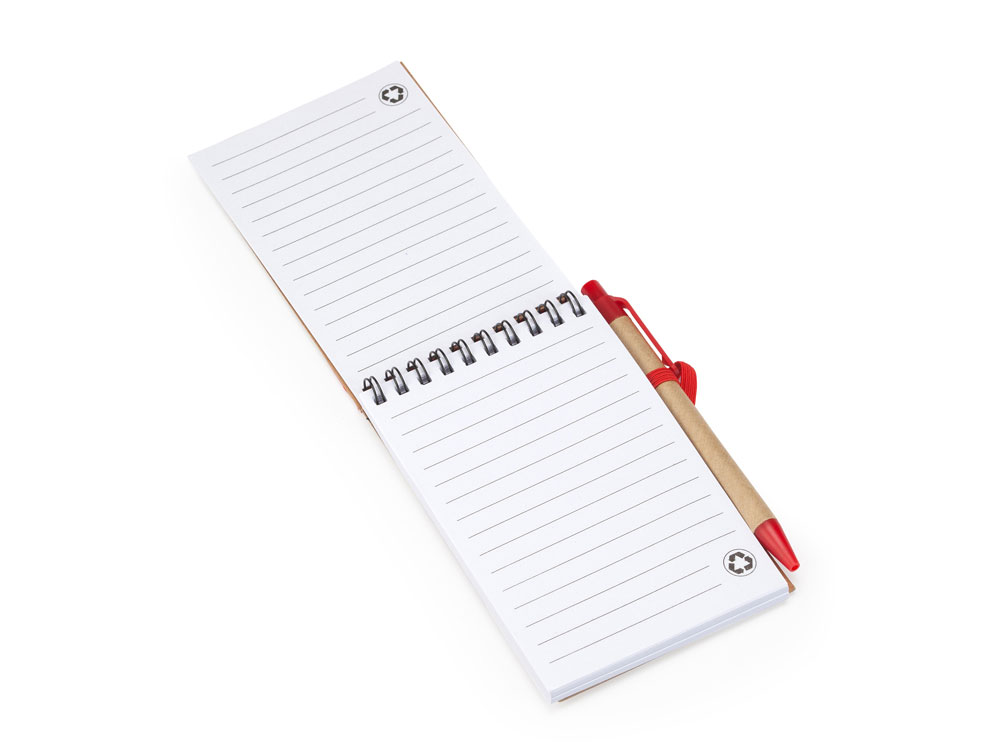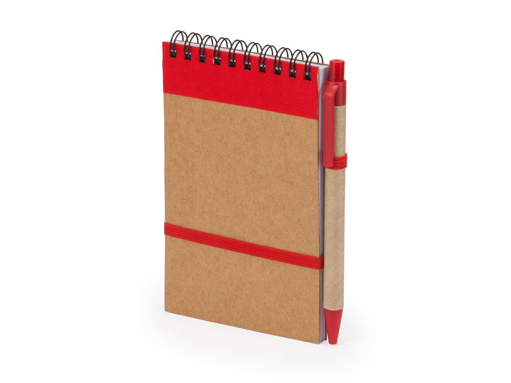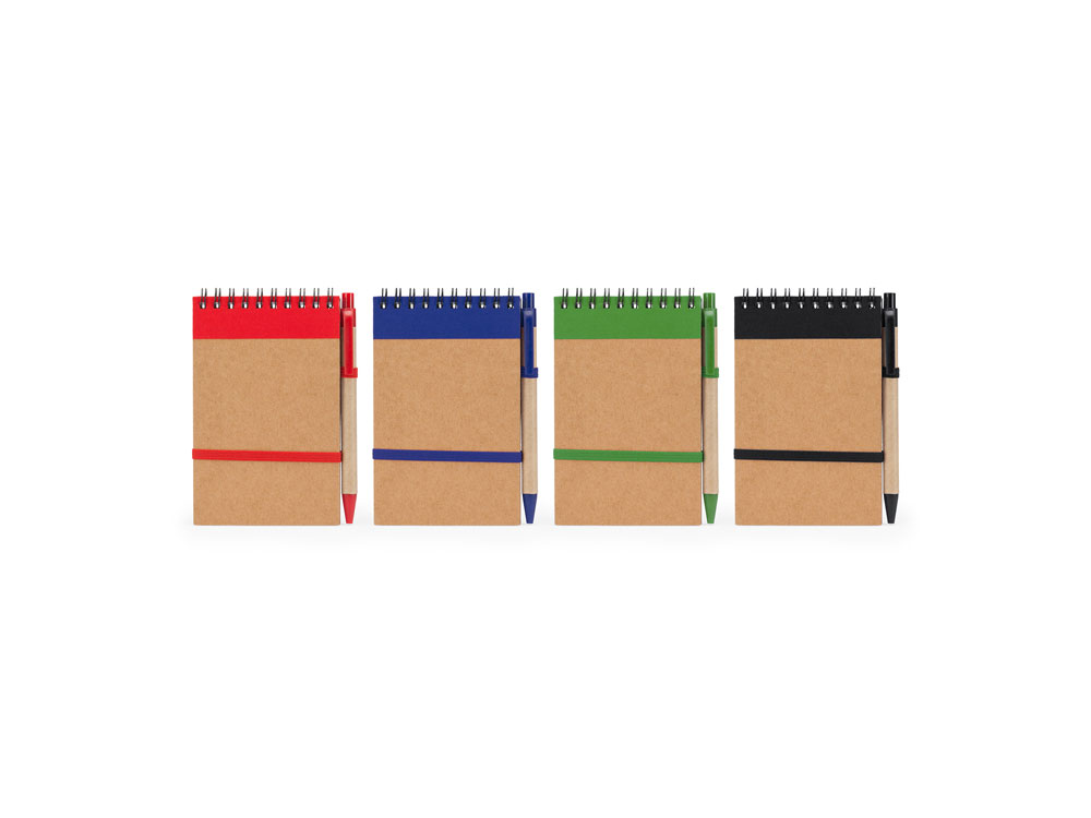Блокнот на спирали с жесткой обложкой из переработанного картона. Включает шариковую ручку с синими чернилами. 70 листов.