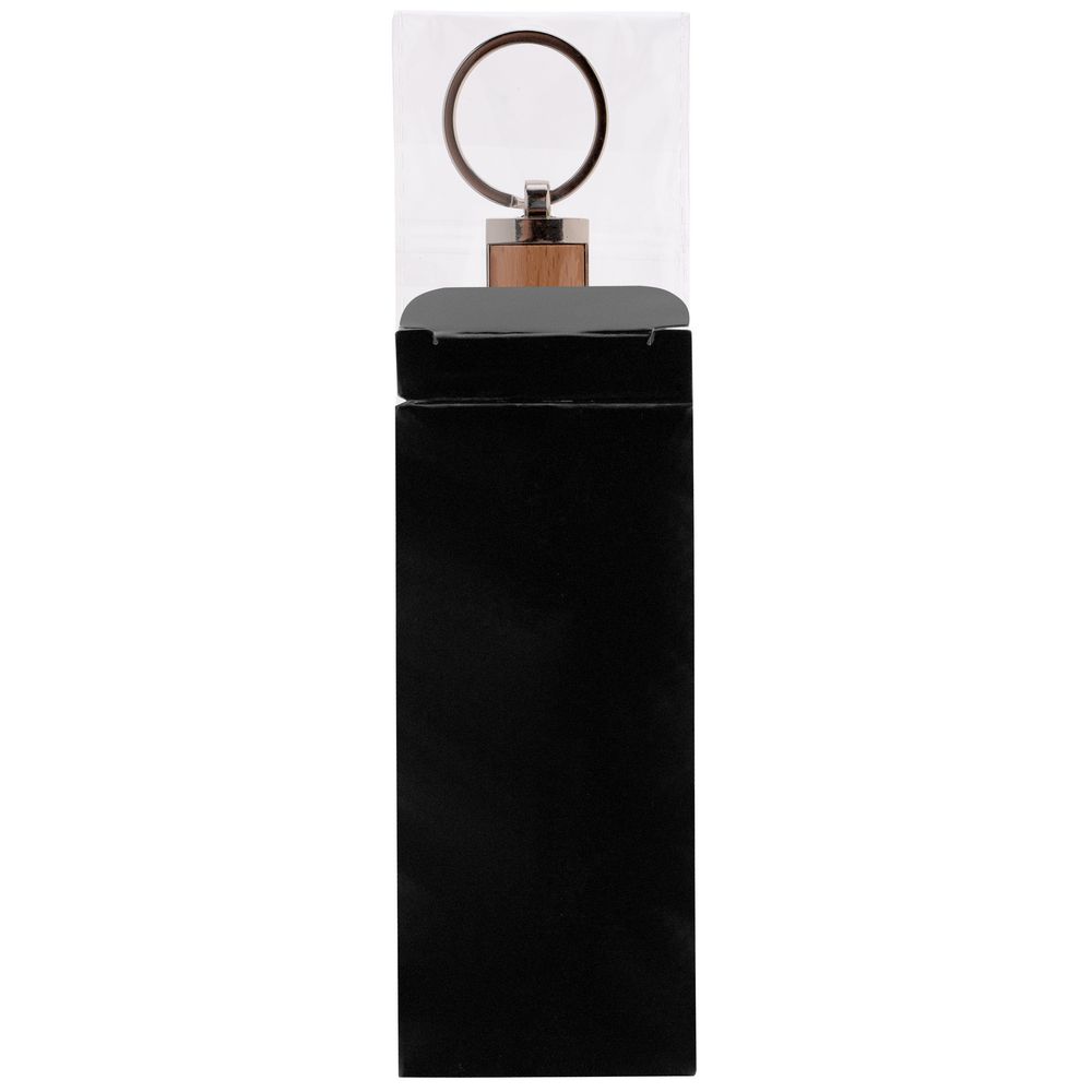 Металлический прямоугольный брелок с деревянной вставкой.