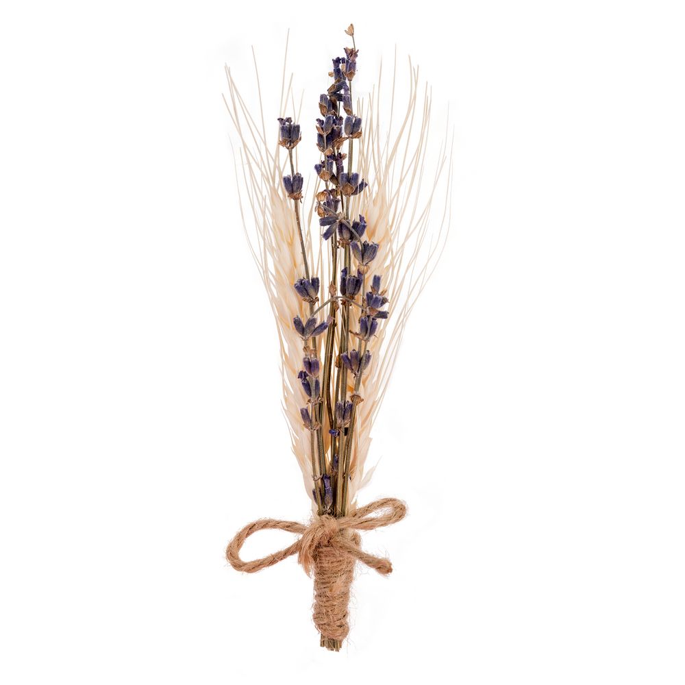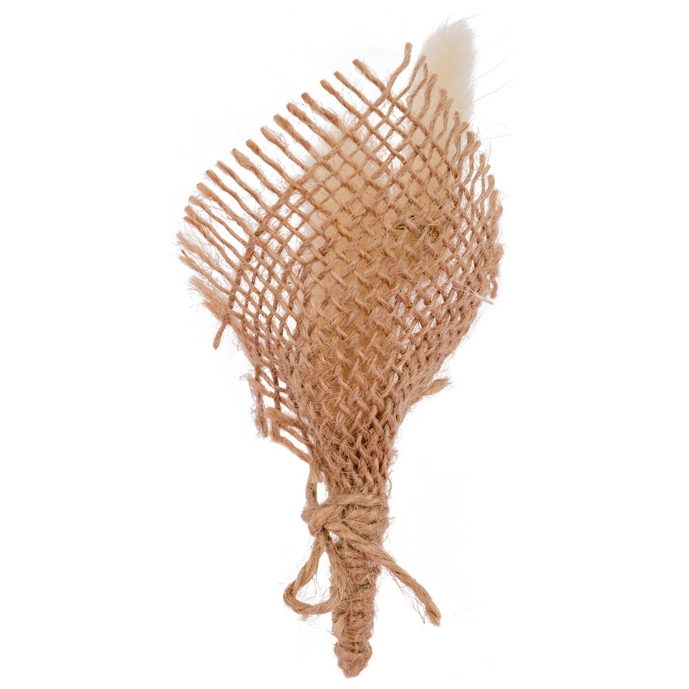 Декоративный букет из 3 веточек ларгуса, 2 выбеленных колосков обернут в джутовую мешковину и перевязан джутовым шпагатом.