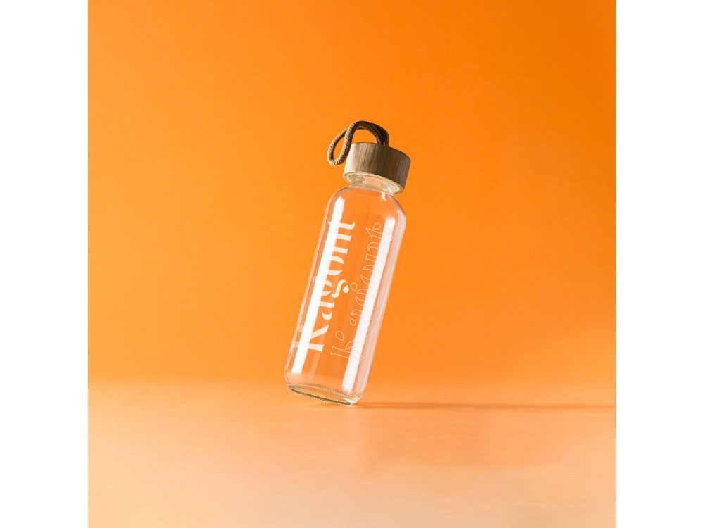 Стеклянная бутылка 450 мл с бамбуковой крышкой и ремешком для переноски с натуральной отделкой. Поставляется в дизайнерской коробке.
