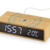 Настольные часы с корпусом из бамбука, имеют функцию беспроводной зарядки для смартфонов (10 Вт). Яркий дисплей. Функция измерения температуры окружающей среды.