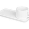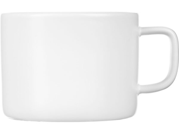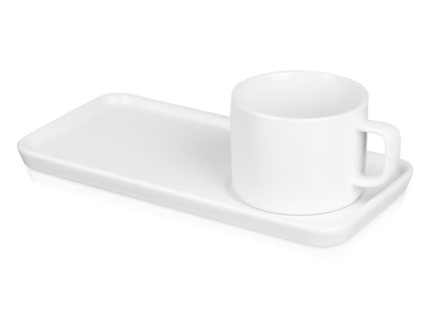 Чайная пара с необычным прямоугольным блюдцем — на нем хватит места не только для чашки, но и для пирожного. Весь силуэт этого комплекта — лаконичный, строгий, прямоугольный, что создает прекрасный фон для нанесения логотипа. Удобство этой чайной пары еще и в том, что для чашки предусмотрена отдельная ниша, которая не даст ей соскользнуть.