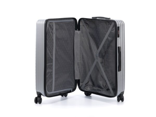 Чемодан полностью раскрывается на 2 вместительных отделения, с перегородкой на молнии и ремнями в форме X для надежной фиксации вещей на месте.