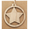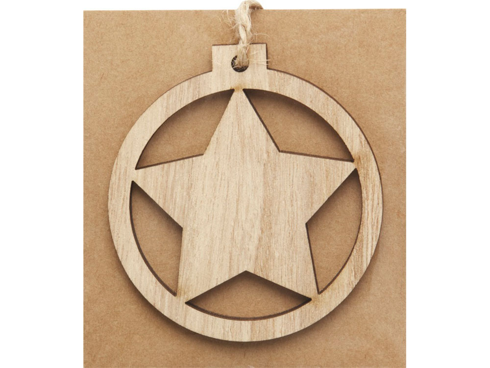 Деревянное украшение круглой формы со звездой внутри, с петлей и шнурком. Упаковано с открыткой из крафт-бумаги на обратной стороне.