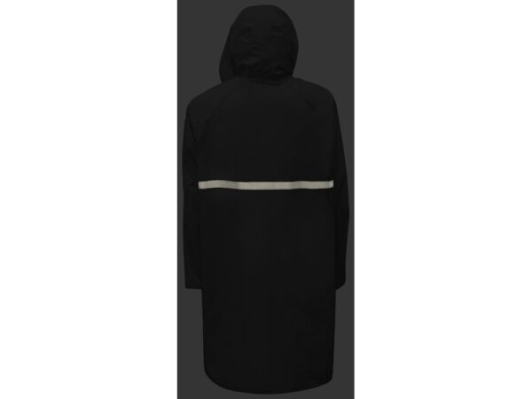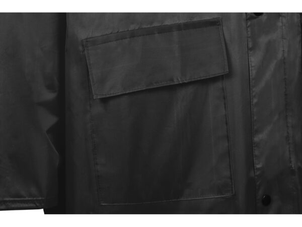 Длинный дождевик выполнен из полиэстера с водоотталкивающей пропиткой. Застегивается на молнию, поверх которой — планка на кнопках, что дополнительно защищает от ветра и промокания. Посадку капюшона можно регулировать при помощи шнурка, ширина рукава регулируется кнопкой.