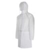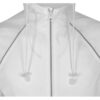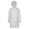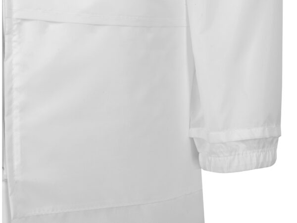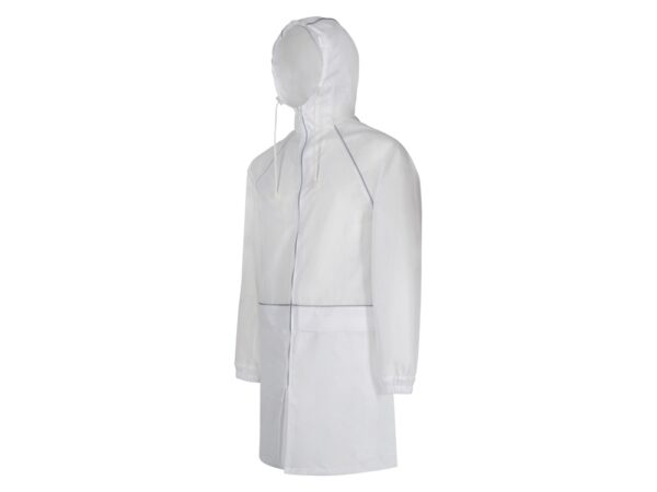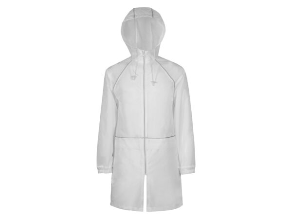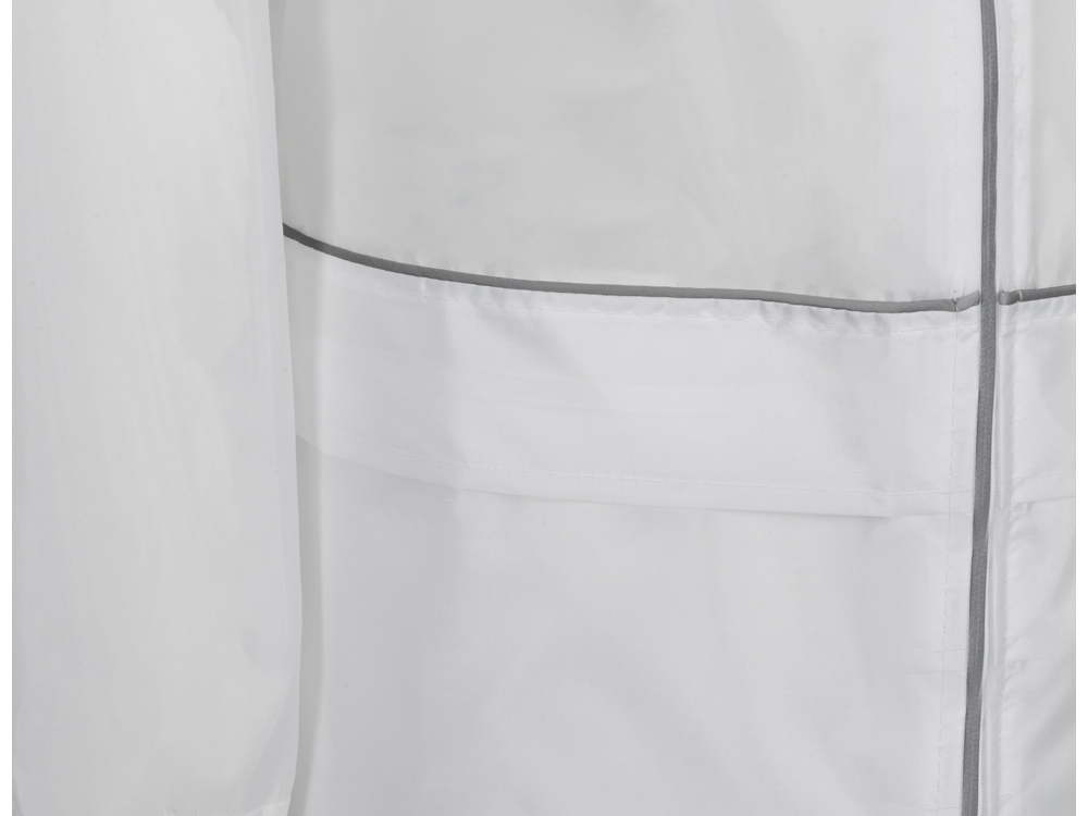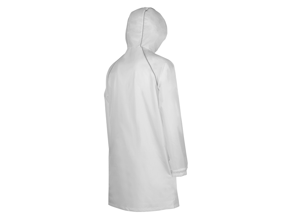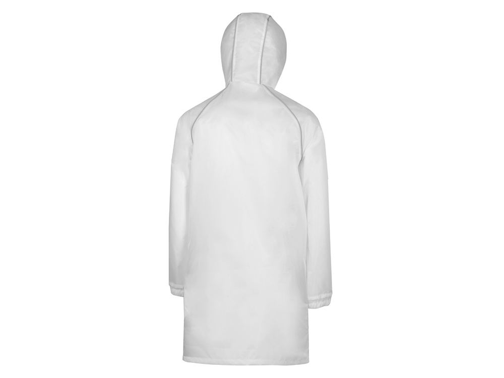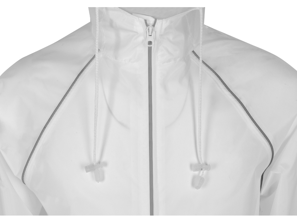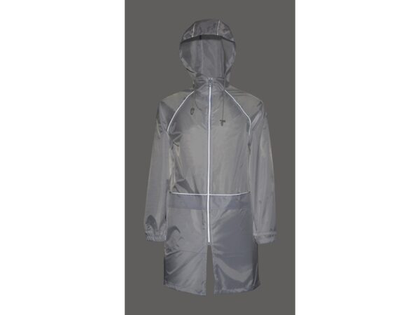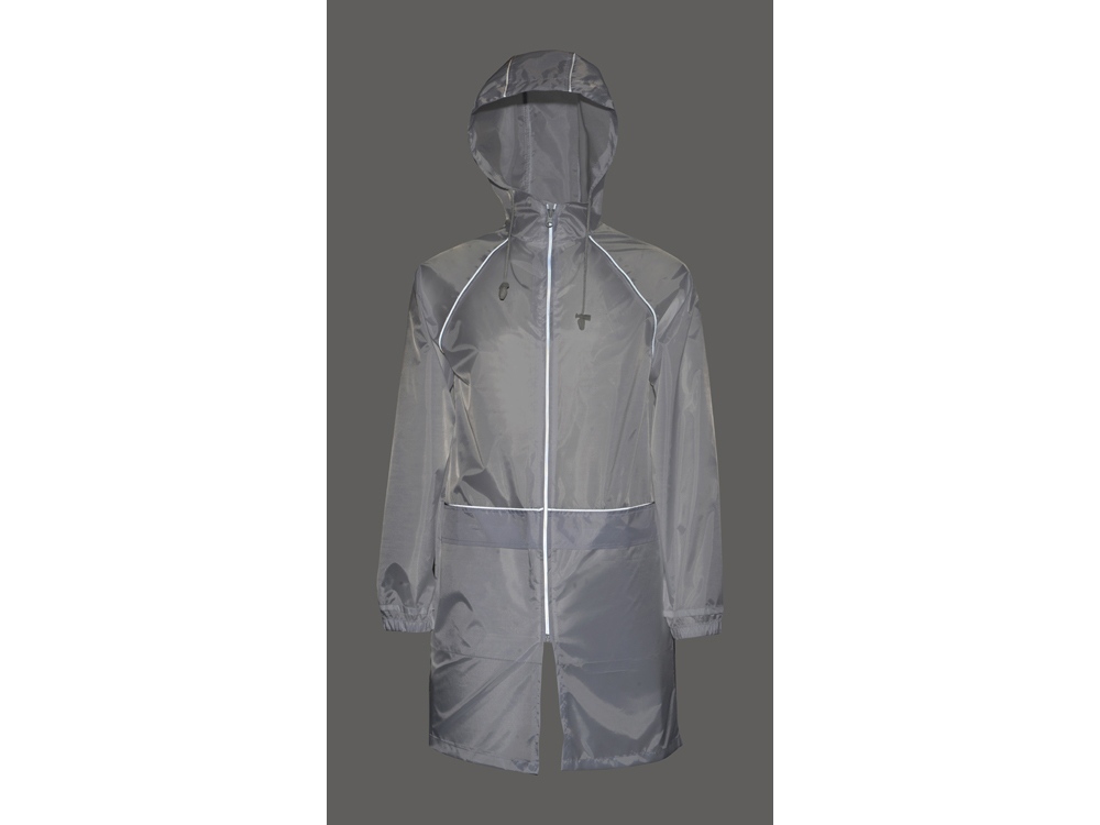 Плащ-дождевик прямого силуэта с капюшоном и рукавом реглан. Застегивается на центральную молнию со светоотражающей полосой с внутренней ветрозащитной планкой. Накладные карманами с клапанами. Двухшовный капюшон с кулиской по краю. Низ рукавов обработан манжетами с внутренней резинкой для комфортной посадке в области запястья. Верхний край клапана кармана, швы капюшона, а также регланные линии обработаны светоотражающим кантом.