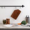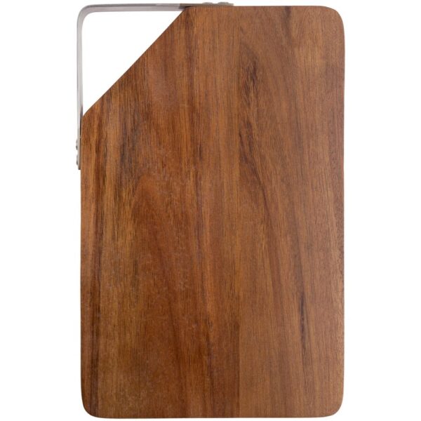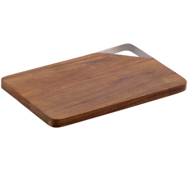 Качественная разделочная доска — необходимый предмет на любой кухне. Доска выполнена из прочного материала — древесины акации. Она обладает высокой твердостью, водоотталкивающими свойствами. Для удобства размещения на стене в верхнем углу предусмотрен подвес из металла.Доска поставляется в пакете.