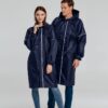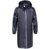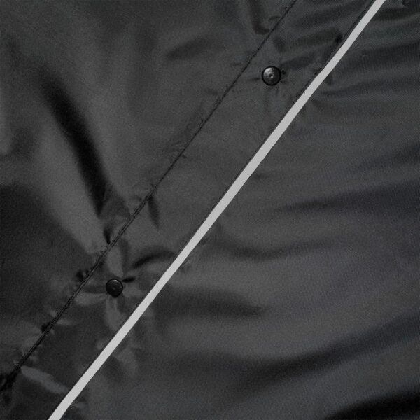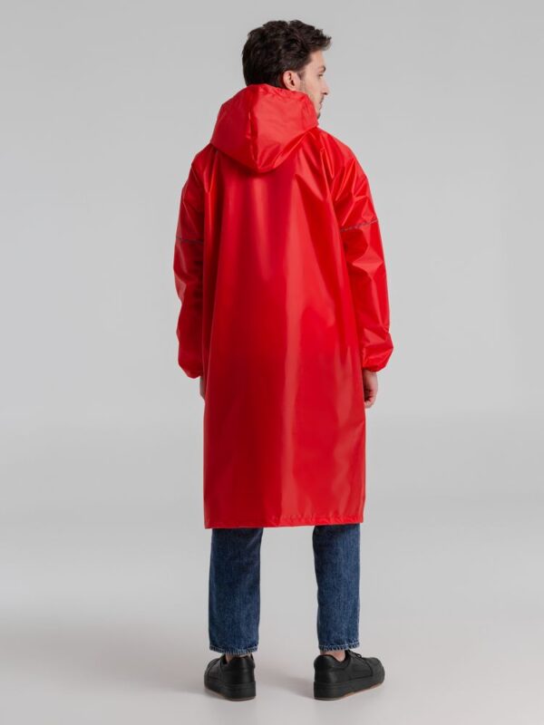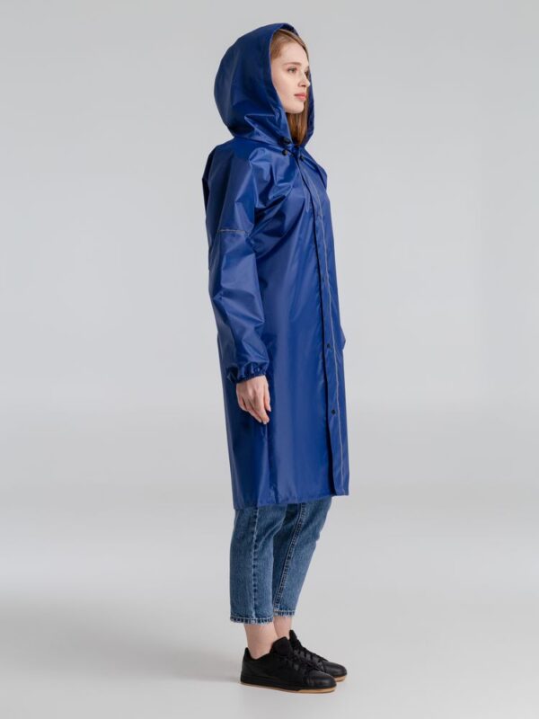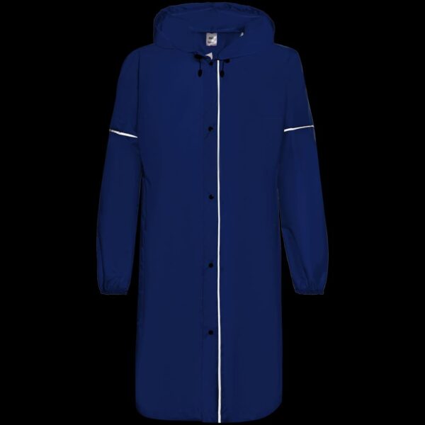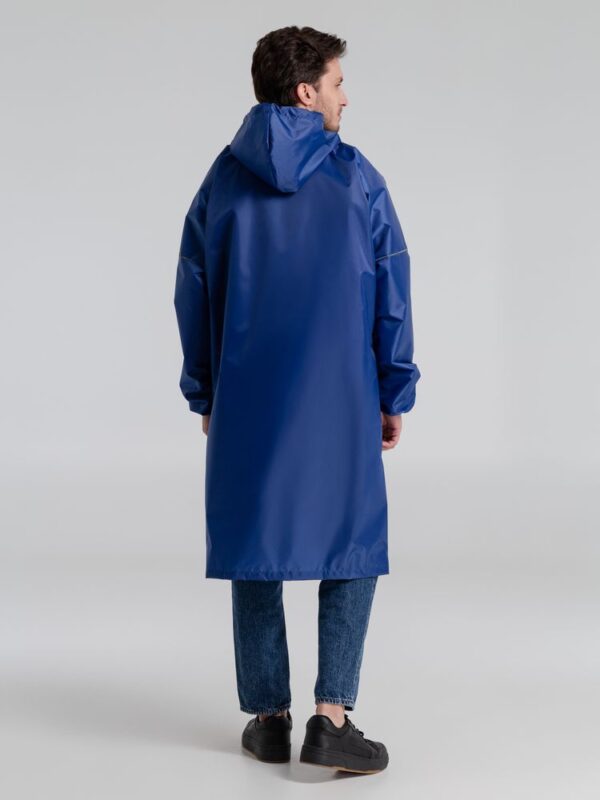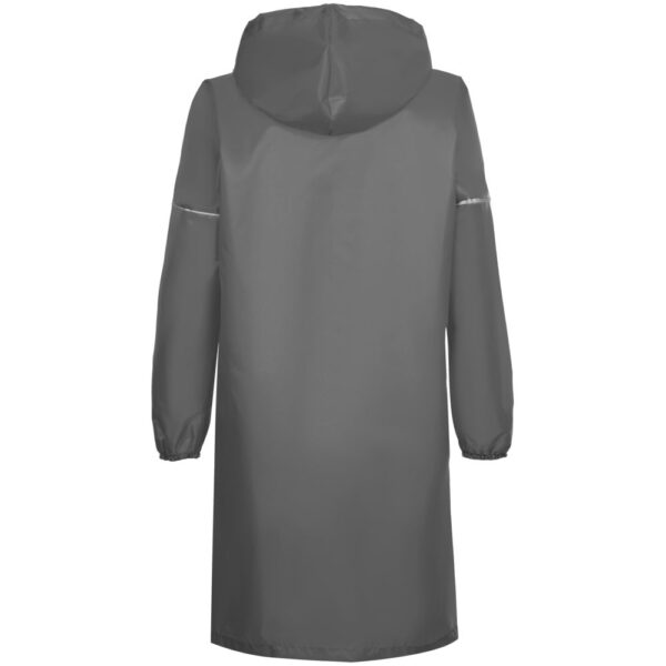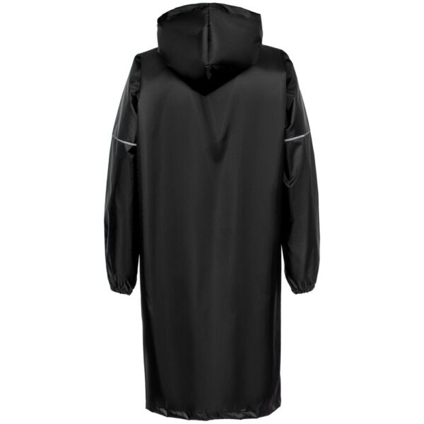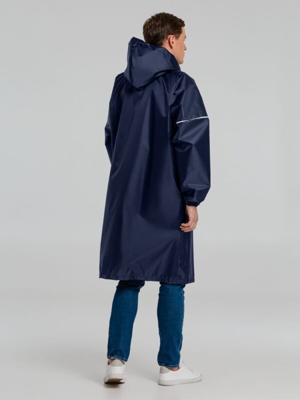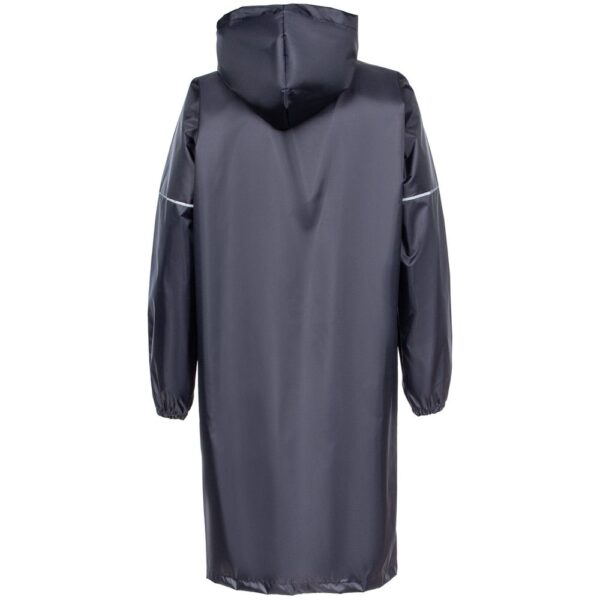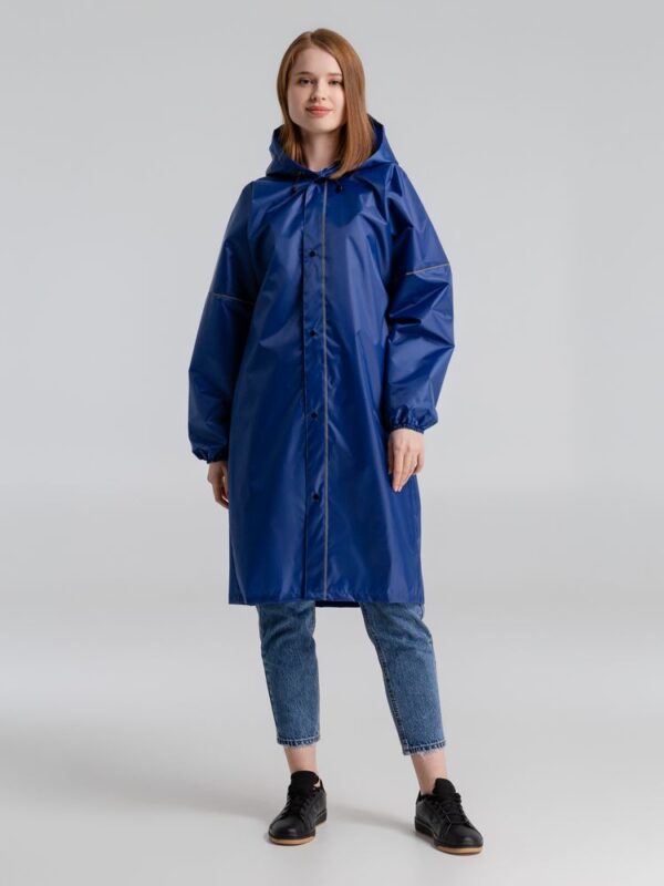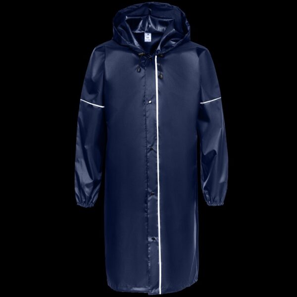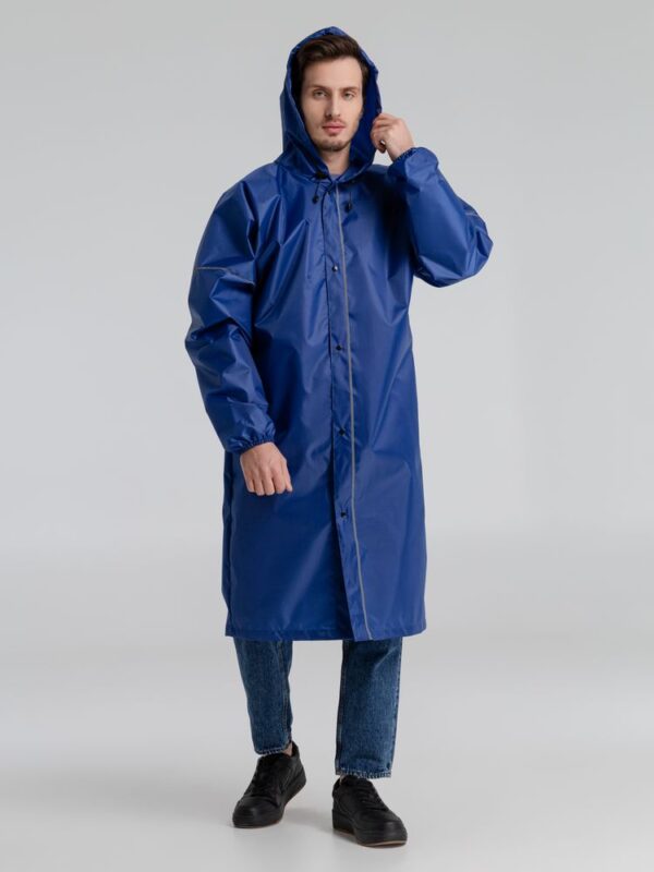 Плащ-дождевик из ткани оксфорд на кнопках с капюшоном. Световозвращающие элементы на рукавах и планке позволяют быть замеченным в темное время суток.