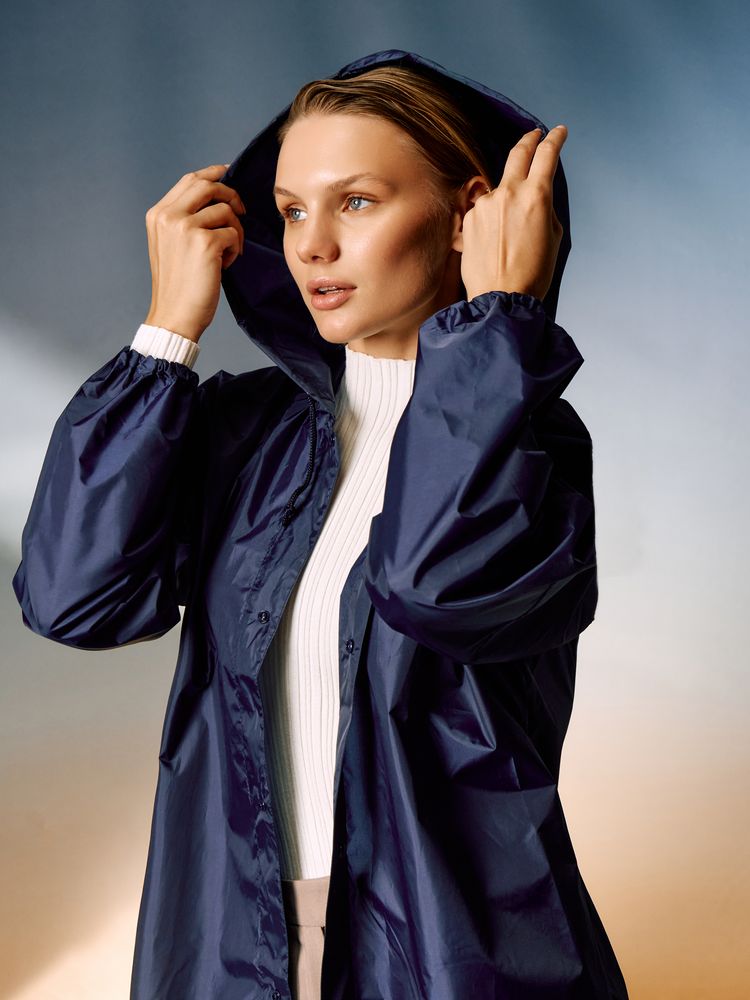Плащ-дождевик из ткани таффета на кнопках с капюшоном.