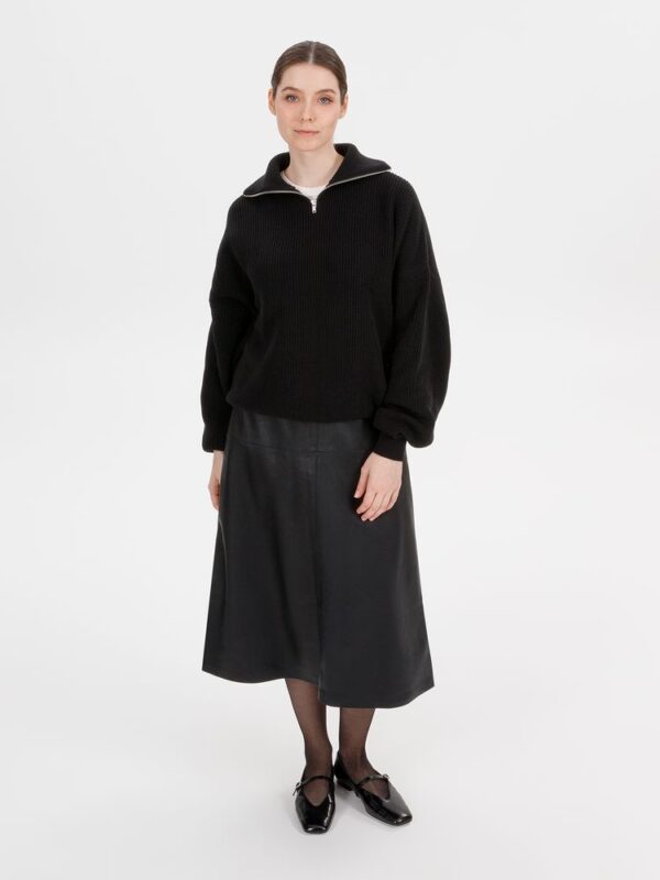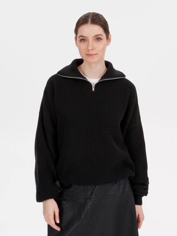 Siluetti Birne — плотный джемпер фактурной вязки со спущенной линией плеча позволит добавить в силуэт мягких линий и ненавязчивого объема, а также создать современный модный образ в лаконичном актуальном стиле, отдав при этом дань беспроигрышной классике. Дополнительным акцентом служит высокая горловина на молнии, а широкая резинка на рукавах и по нижнему краю изделия гарантирует максимальный комфорт.