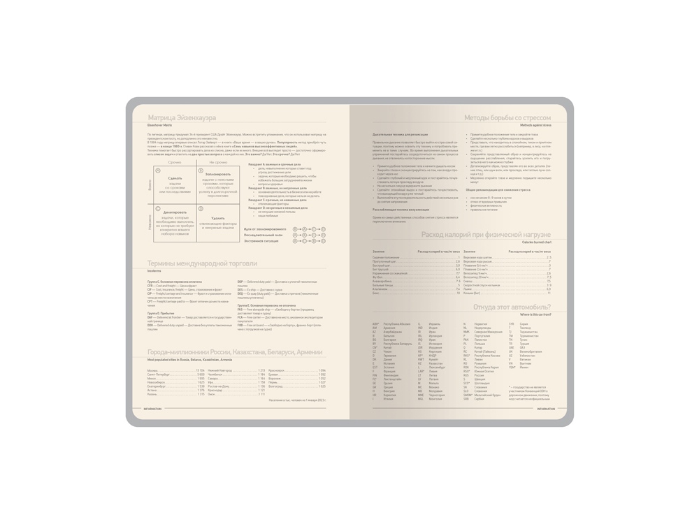 Блок произведен из бежевой бумаги плотностью 70 г/кв.м и помимо раздела для планирования содержит справочную информацию