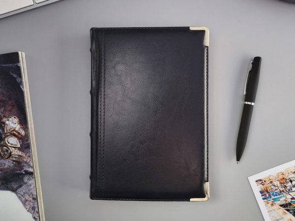Классический деловой ежедневник линии Boss – образец элегантности. Гладкую тонкую фактуру экокожи подчеркивает декоративная строчка по контуру и металлические закругленные уголки золотистого цвета.