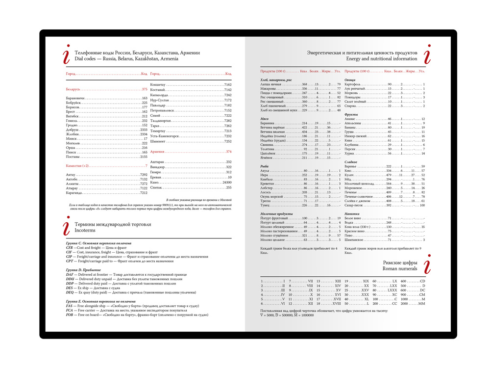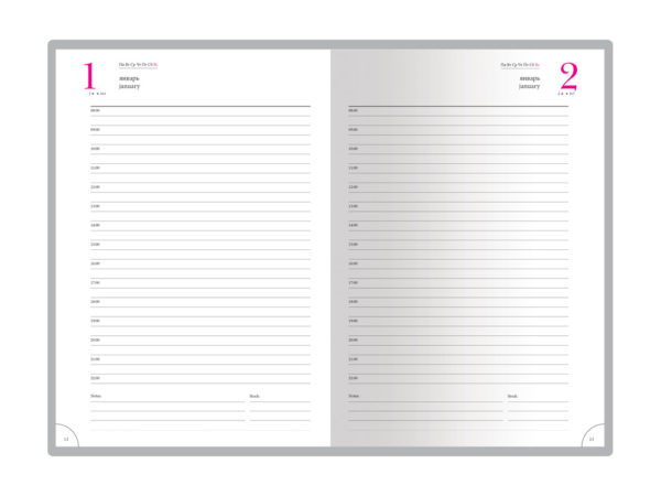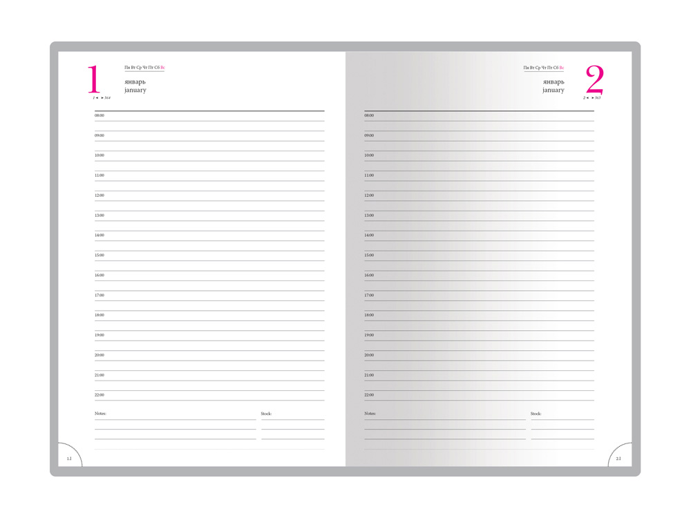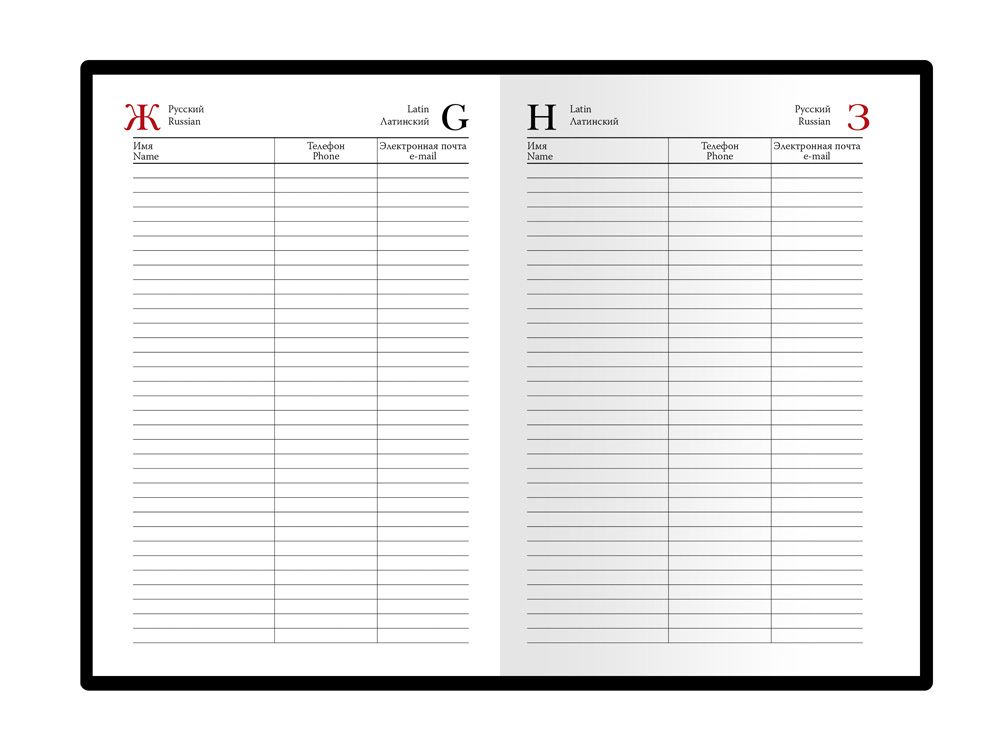 В ежедневнике есть полезная справочная информация и телефонная книга, а также страницы для записи идей, мыслей и составления рабочих планов. Есть перфорация (нижние уголки отрывные). Для изготовления страниц используется качественный бежевый офсет повышенной плотности (80 г/кв м), которая производится японской фирмой «Daiwa» и подходит для всех видов чернил.
