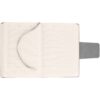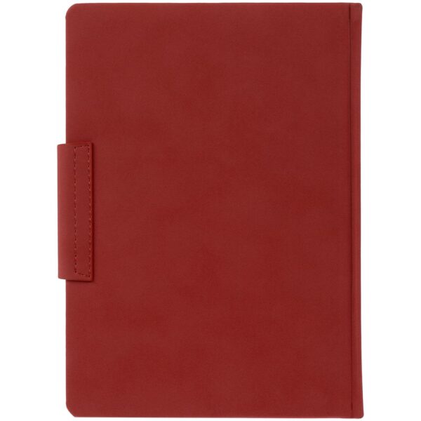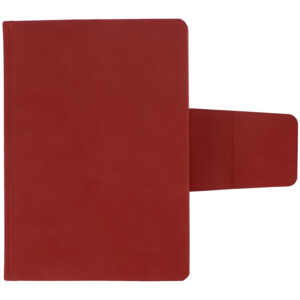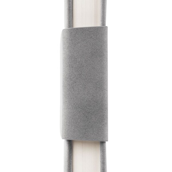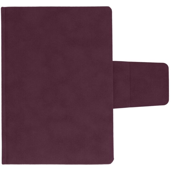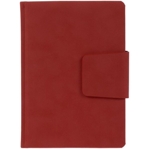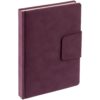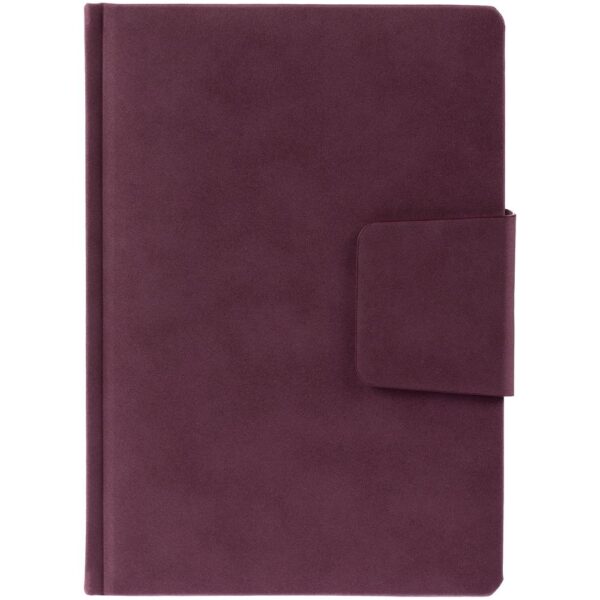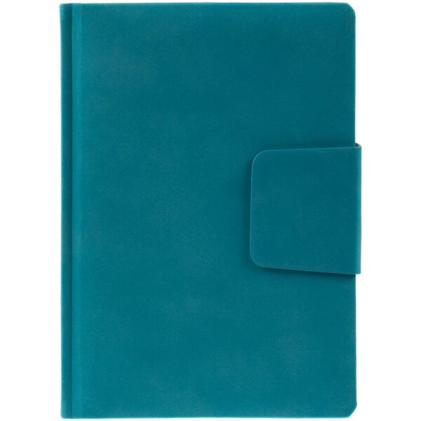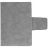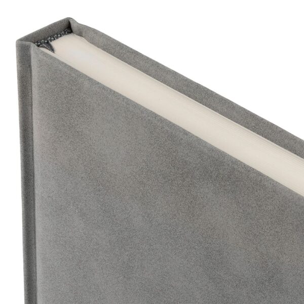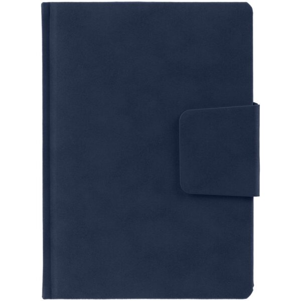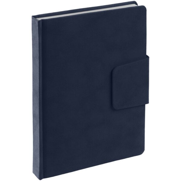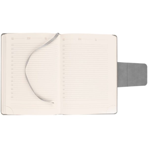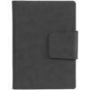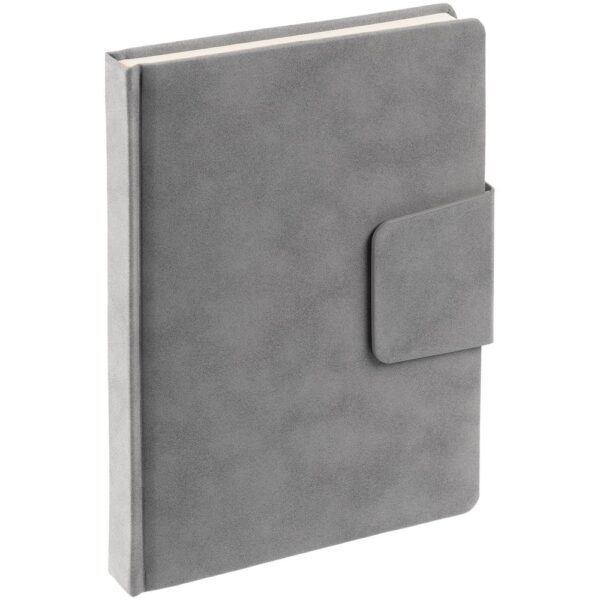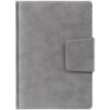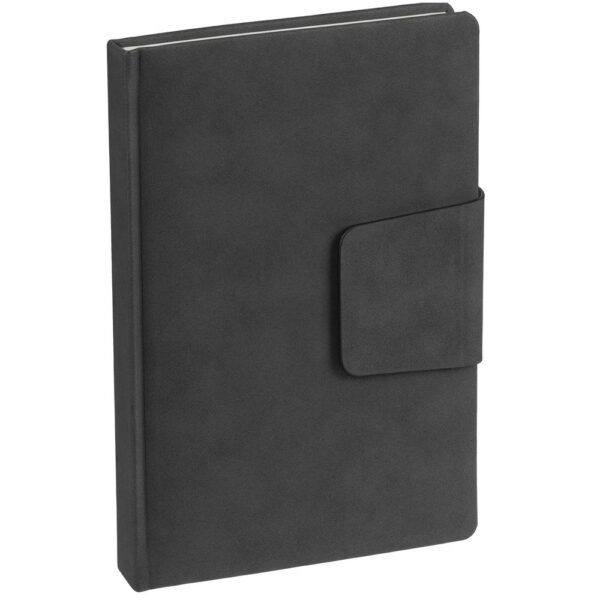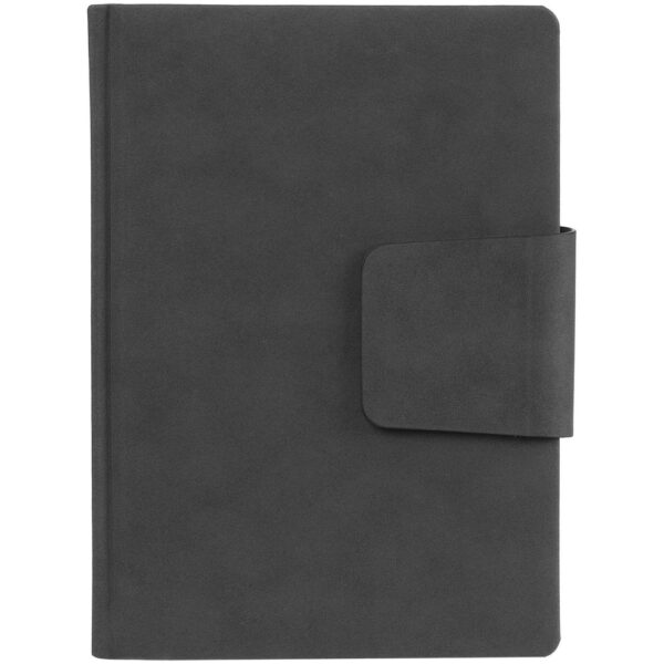 Ежедневник с твердой обложкой c поролоном, выполнен из материала Nubuck, темно-серый ЕЕ, дополнен капталом и ляссе черного цвета. Застежка — магнитный хлястик.