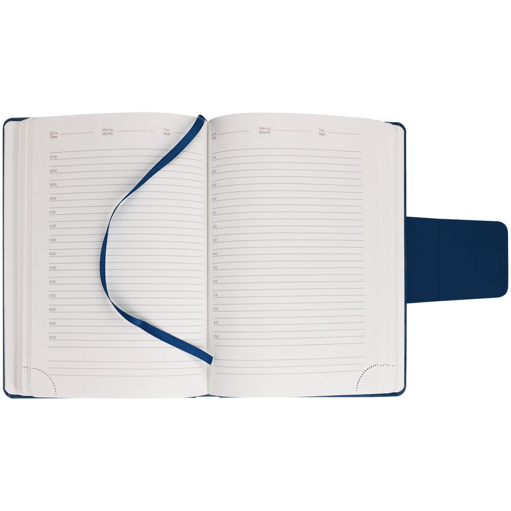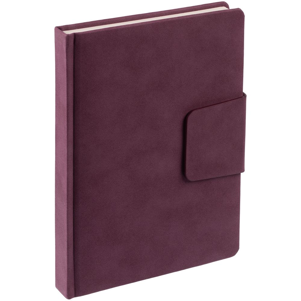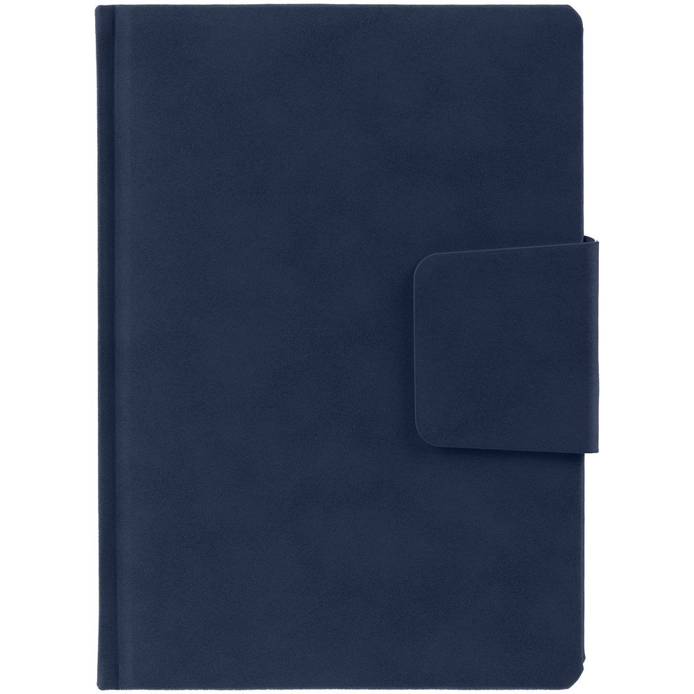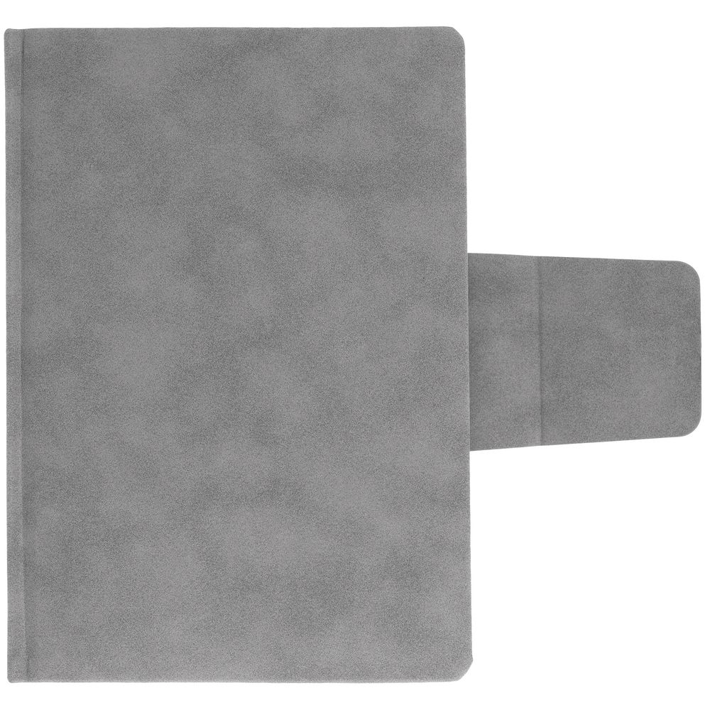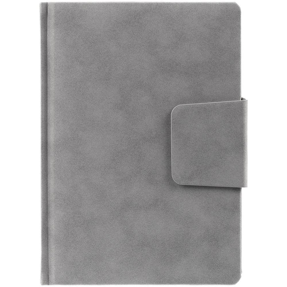 Ежедневник с твердой обложкой c поролоном, выполнен из материала Nubuck, темно-серый ЕЕ, дополнен капталом и ляссе черного цвета. Застежка — магнитный хлястик.