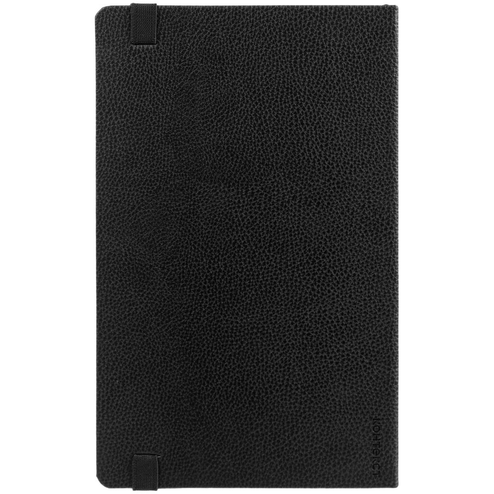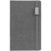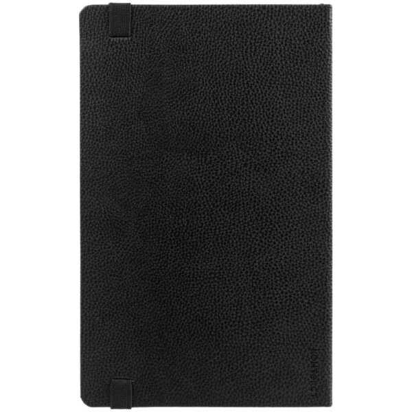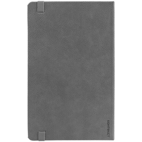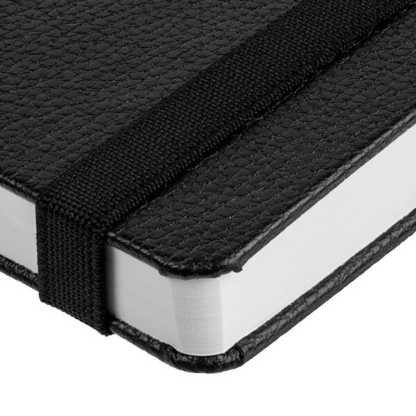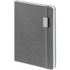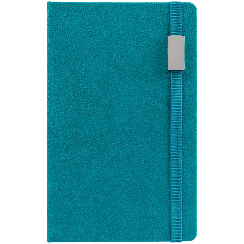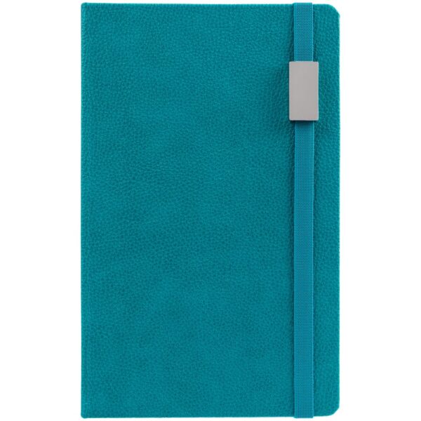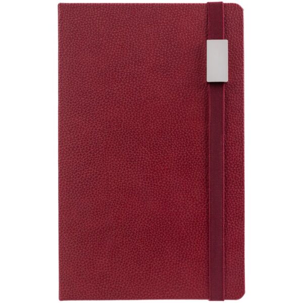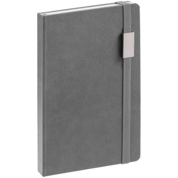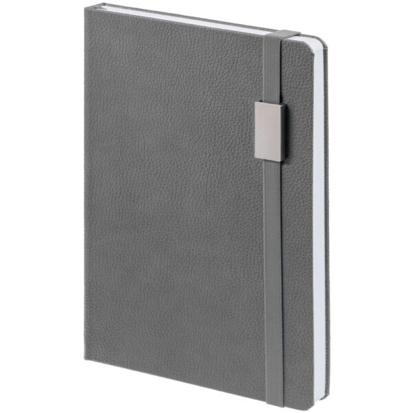 Зауженный ежедневник с прямоугольным металлическим шильдом на резинке.