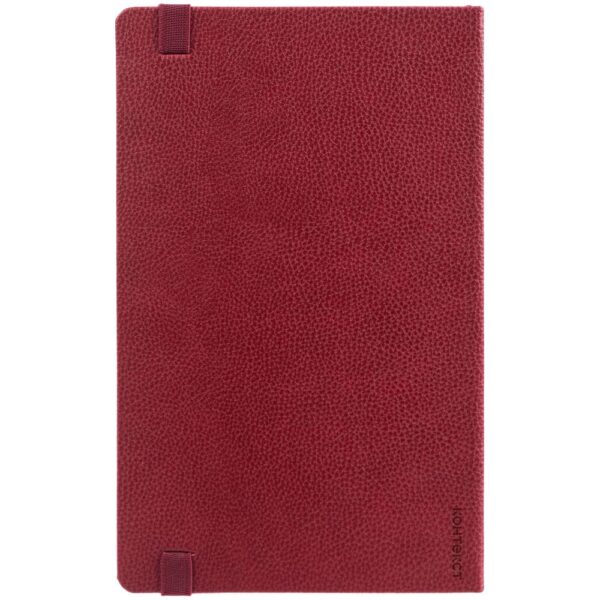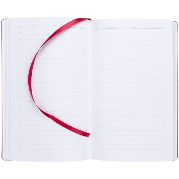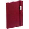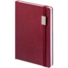 Ежедневник с твердой обложкой, выполнен из материала LaFite, красный РР, дополнен резинкой с металлическим прямоугольным шильдом и ляссе в цвет обложки.