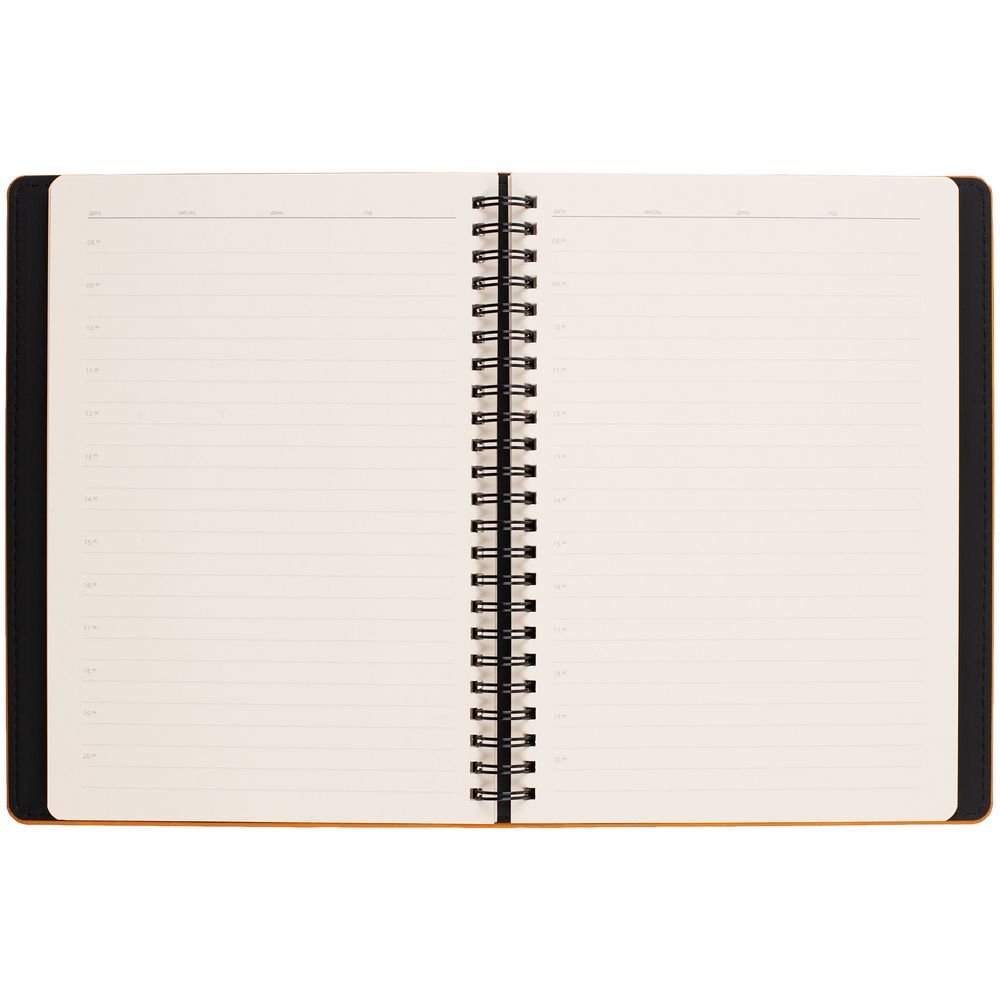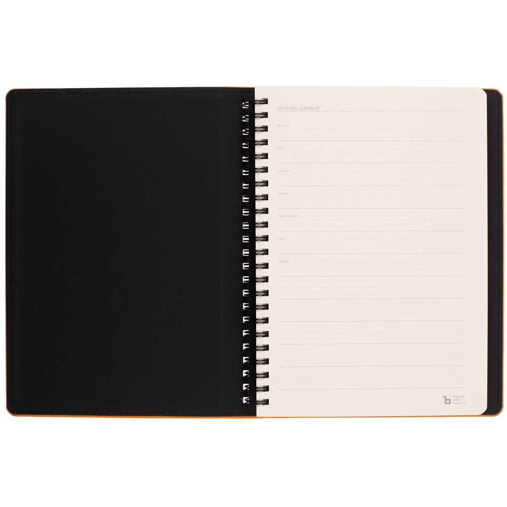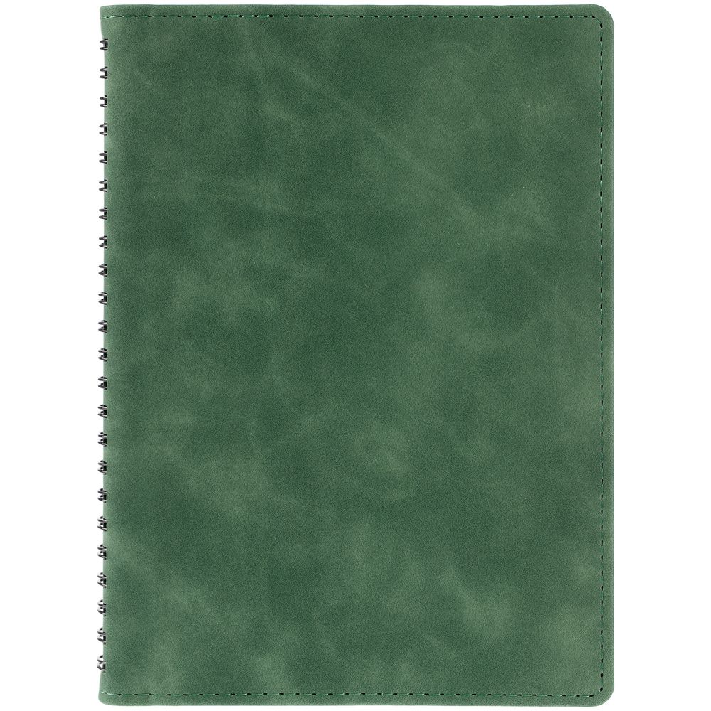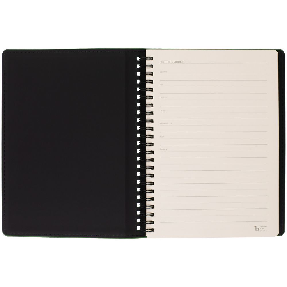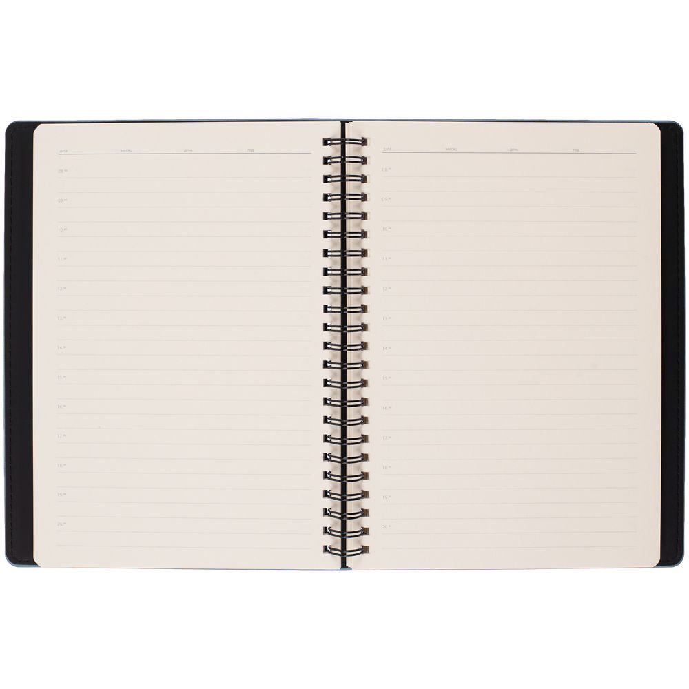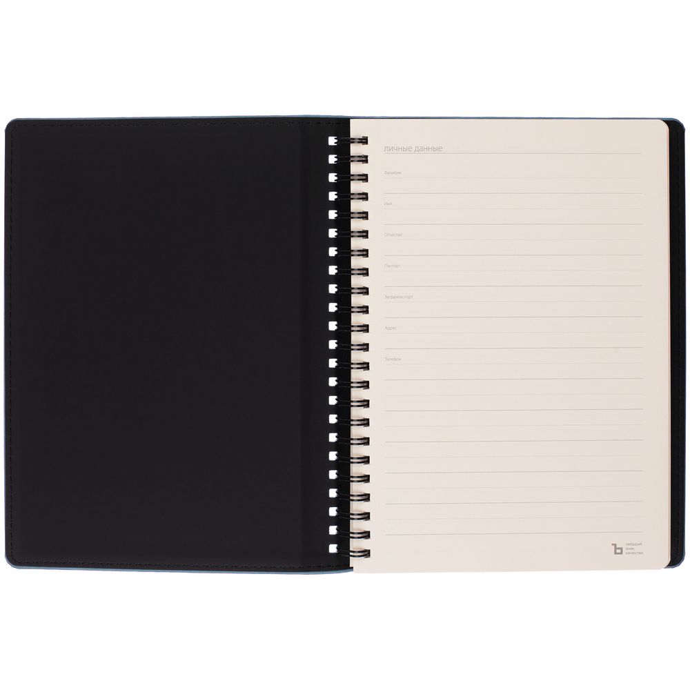 Ежедневник с блоком на пружине в твердой обложке, выполнен из материалов Nubuk Touch, серый СС и Soft Touch, черный AA.