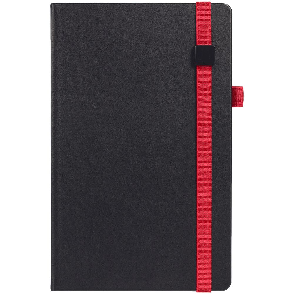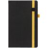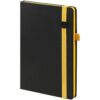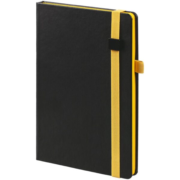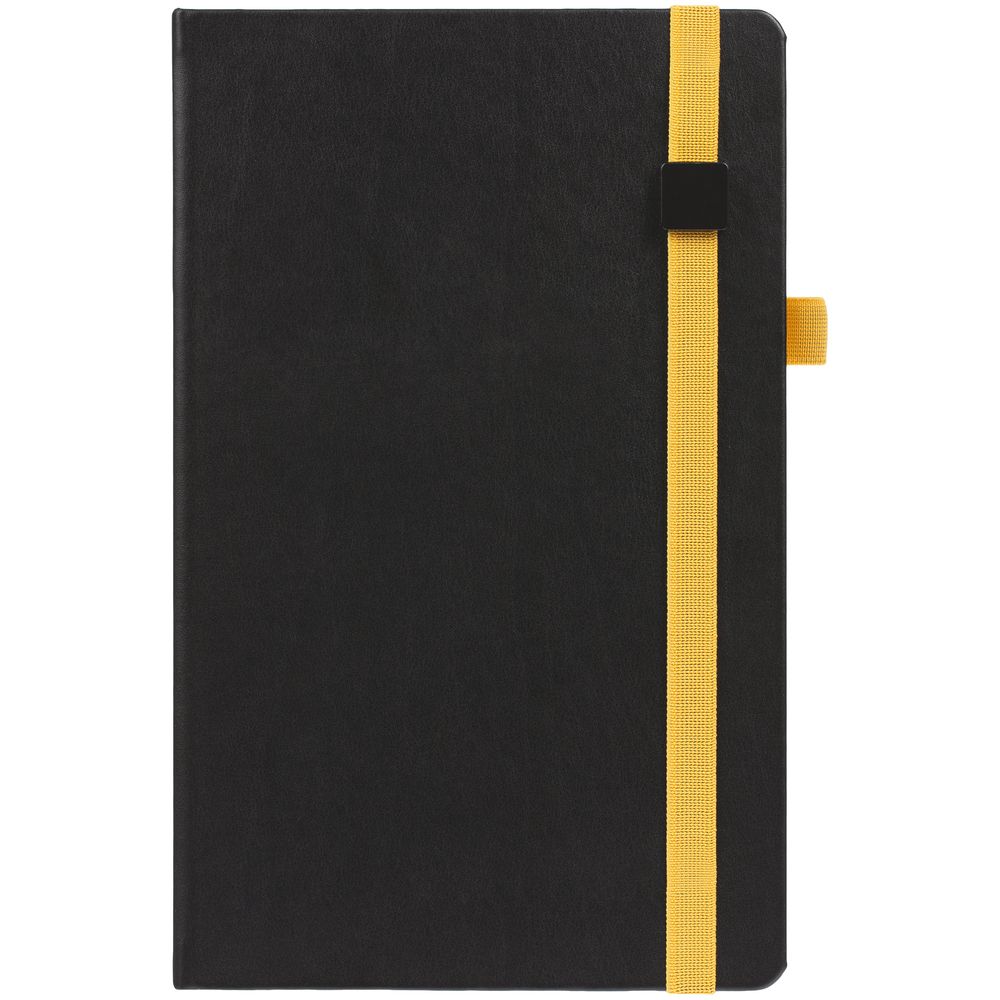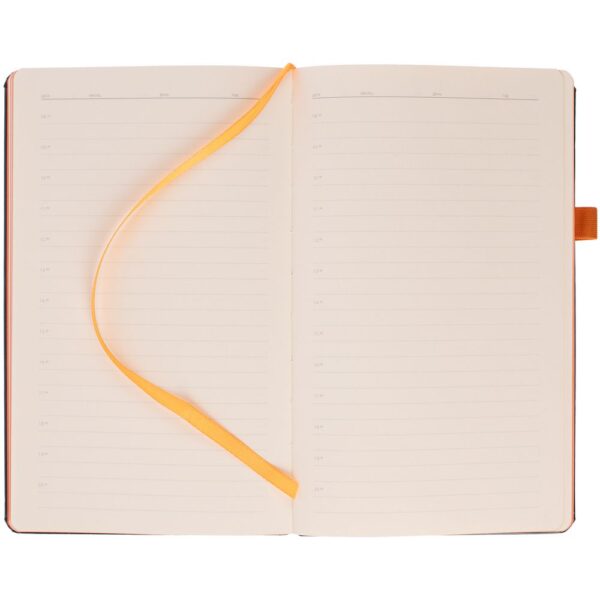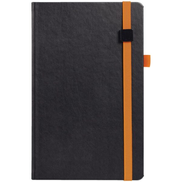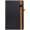 Ежедневник с полутвердой обложкой, выполнен из материала Waltz, черный АА, дополнен оранжевой резинкой с металлическим шильдом и ляссе.