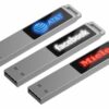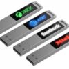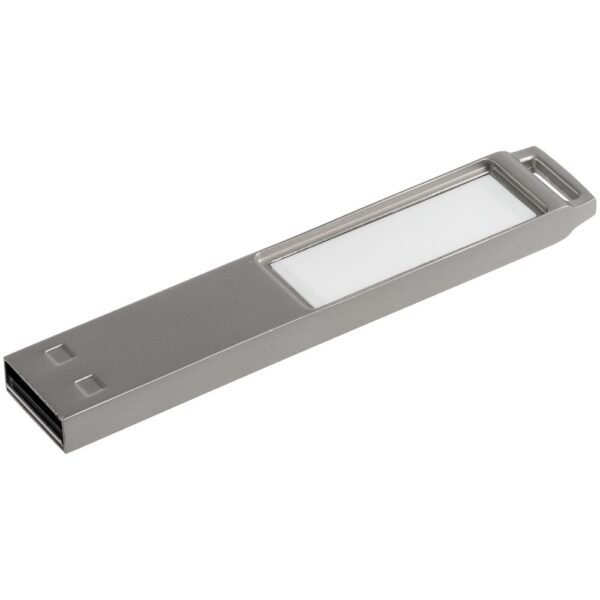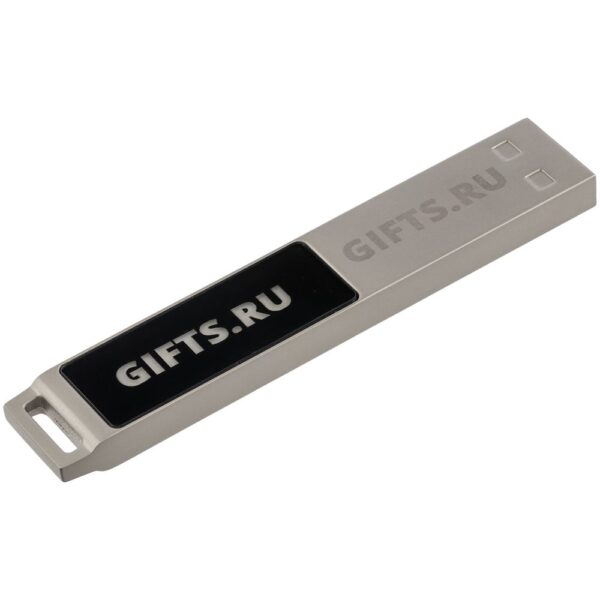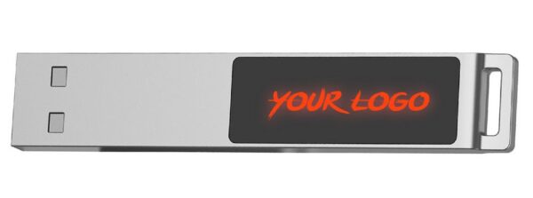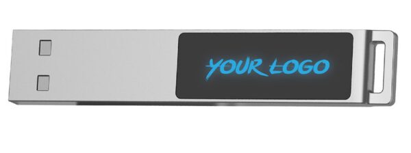 Флешка в тонком металлическом корпусе с пластиковой самоклеящейся шильдой в комплекте. Благодаря встроенной в корпус светодиодной матрице, логотип, выполненный на шильде методом лазерной гравировки, подсвечивается белым, красным, зеленым или синим в зависимости от выбранной модели.