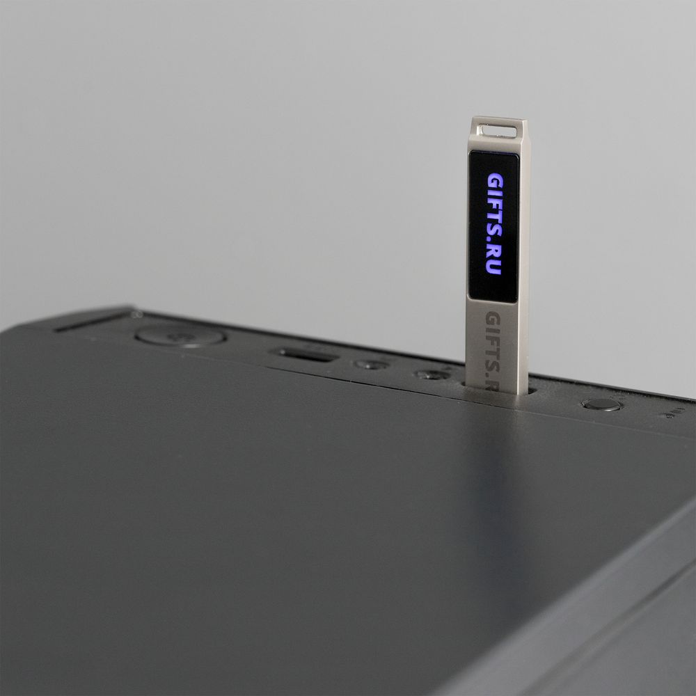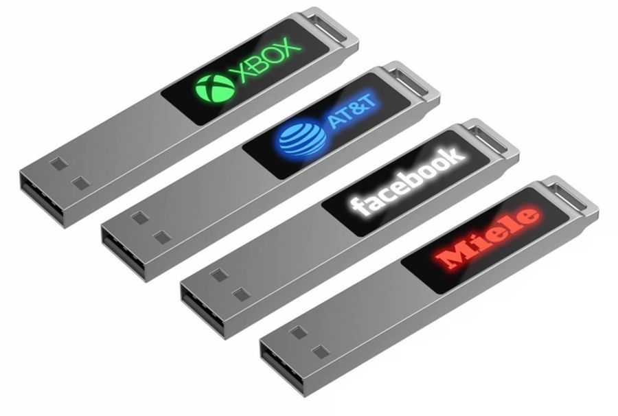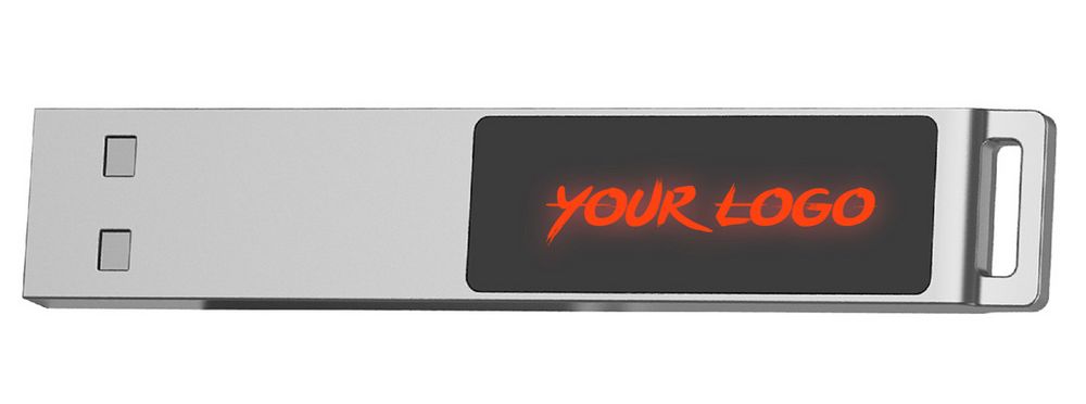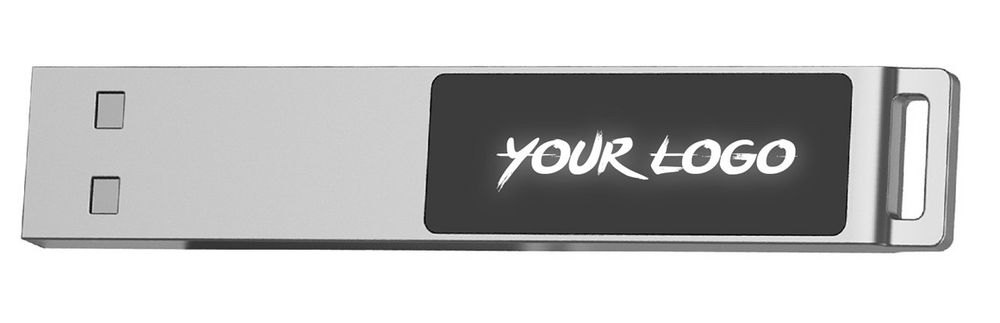 Флешка в тонком металлическом корпусе с пластиковой самоклеящейся шильдой в комплекте. Благодаря встроенной в корпус светодиодной матрице, логотип, выполненный на шильде методом лазерной гравировки, подсвечивается белым, красным, зеленым или синим в зависимости от выбранной модели.