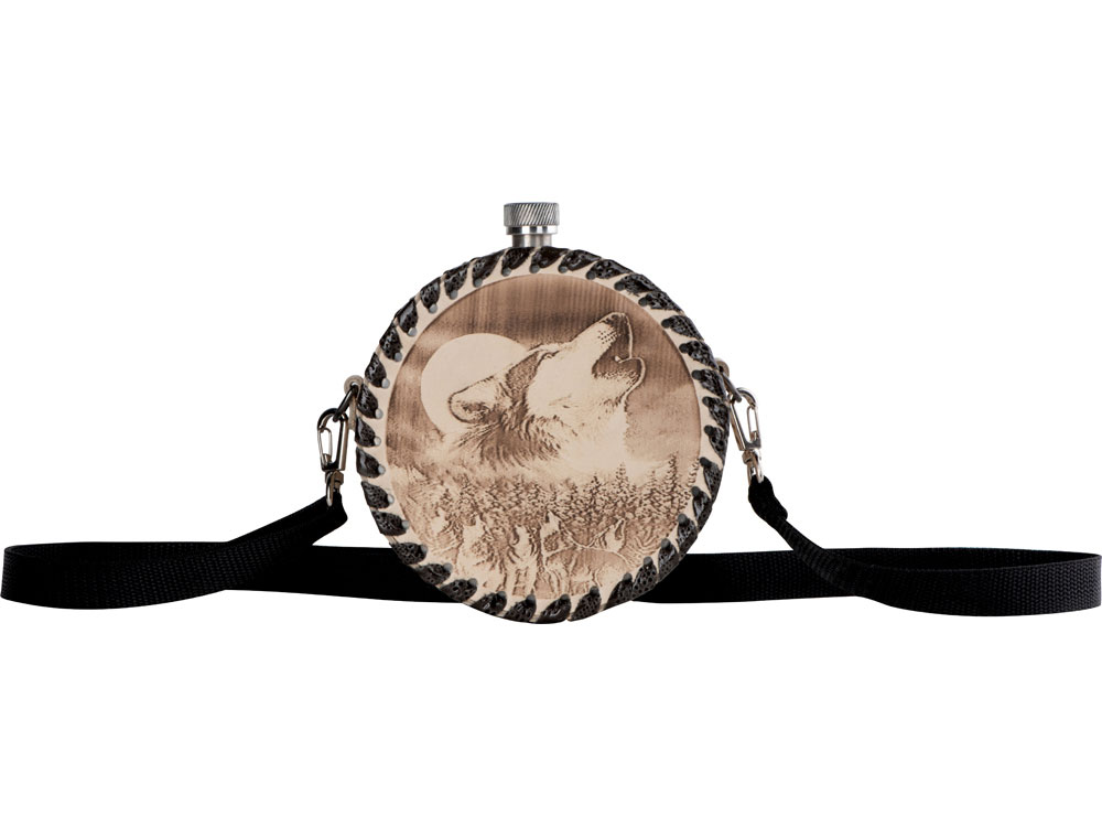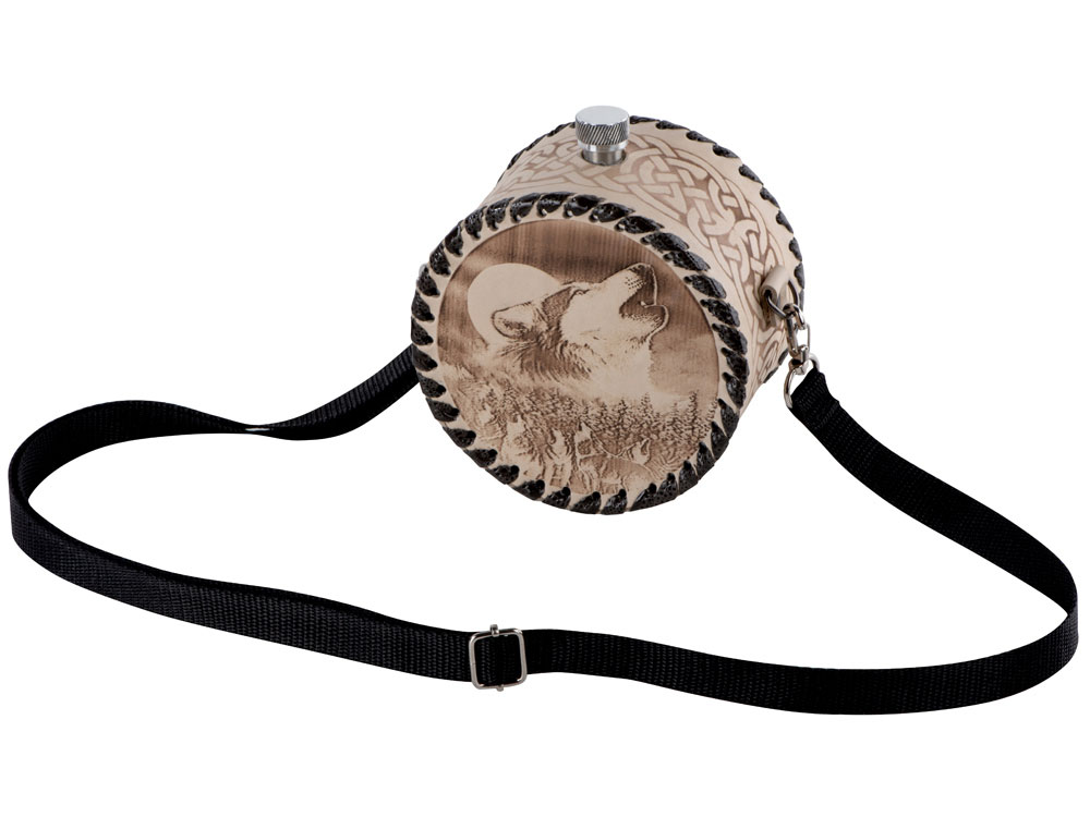 Фляга 1л в оплетке из натуральной кожи с нанесением рисунка методом художественного выжигания.