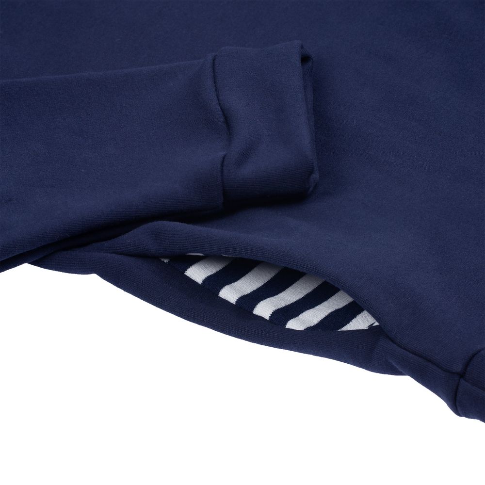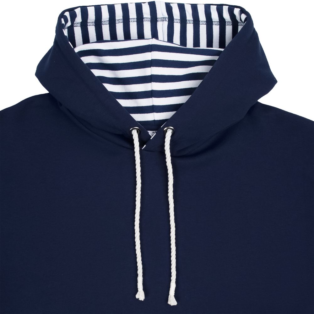 Морской стиль в одежде — это всегда особая атмосфера, пропитанная соленым воздухом, легким бризом и шумом волн. Худи Seamark подарит ощущение свободы и легкости. Его с удовольствием можно носить как в городе, так и во время отдыха на яхте, путешествия на круизном лайнере или плавания на парусной регате. Дополнительный шарм изделию придают хлопковый канат для регулировки капюшона и полосатая подкладка на капюшоне и в карманах.