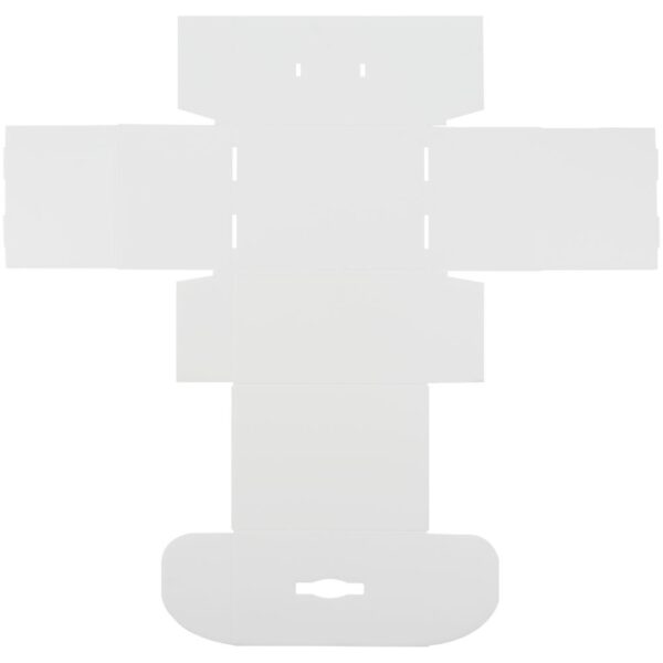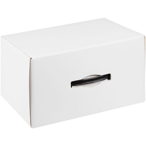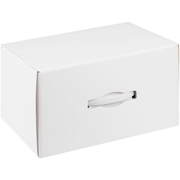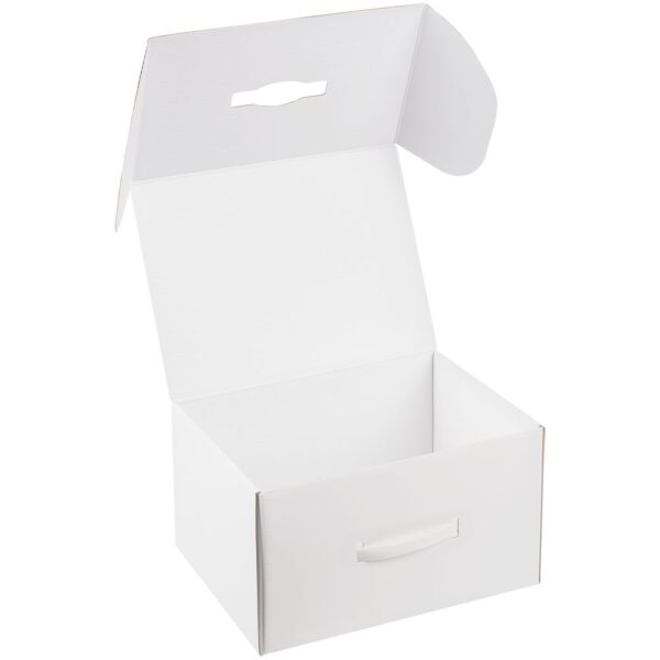 Самосборная коробка-шкатулка со вставной пластиковой ручкой.