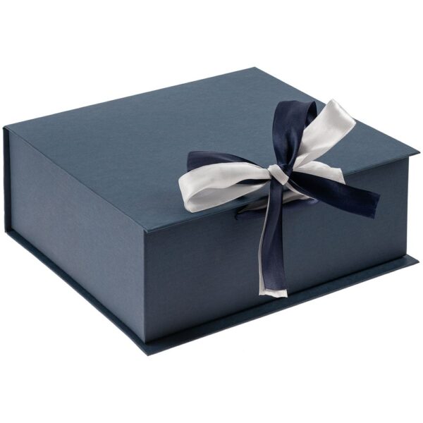 Коробка выполнена из переплетного картона, кашированного дизайнерской бумагой Malmero «Благородный синий», с крышкой на лентах.