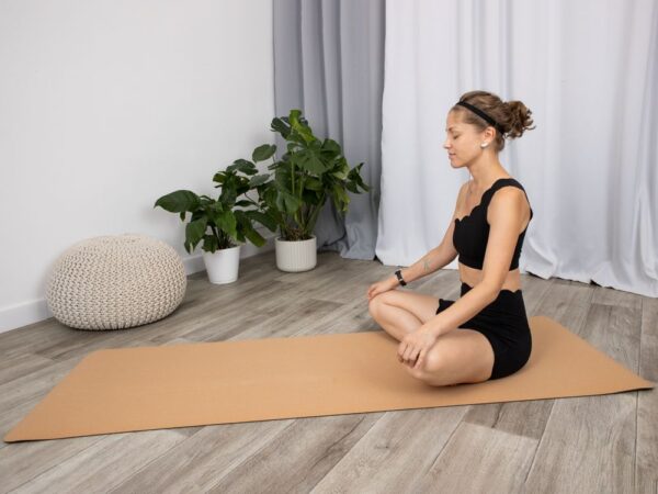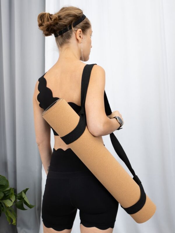 Лицевая сторона выполнена из пробки — экологичного, теплого и приятного на ощупь материала, а обратная из ТПЭ — термопластичного эластомера, который гарантирует надежное сцепление коврика с поверхностью.