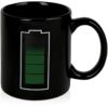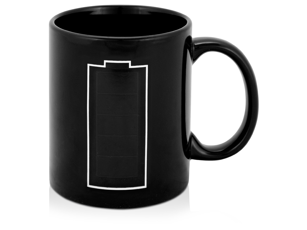 Креативная керамическая кружка на 320 мл черного цвета имитирует индикатор заряда батареи. Просто налейте в нее горячий напиток и батарейка «зарядится». Замечательный подарок для любителей необычных вещей.