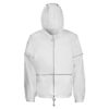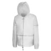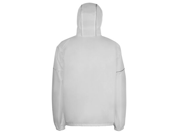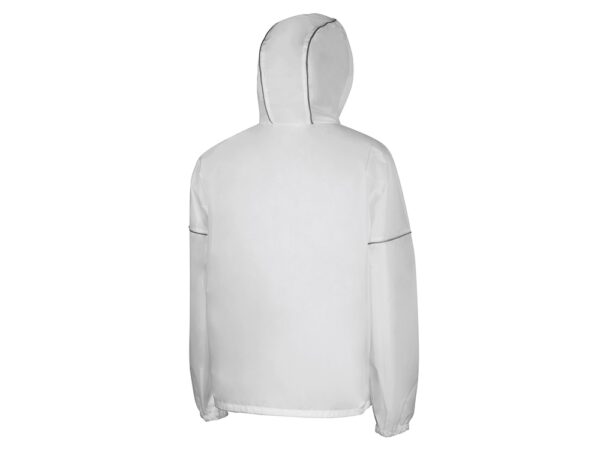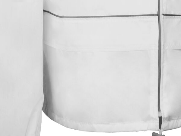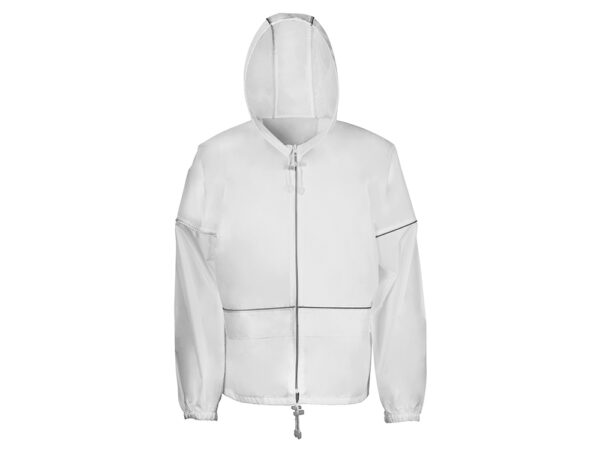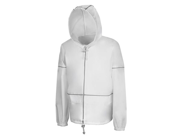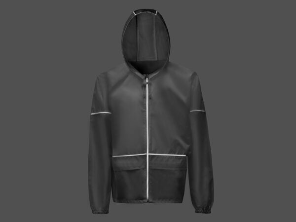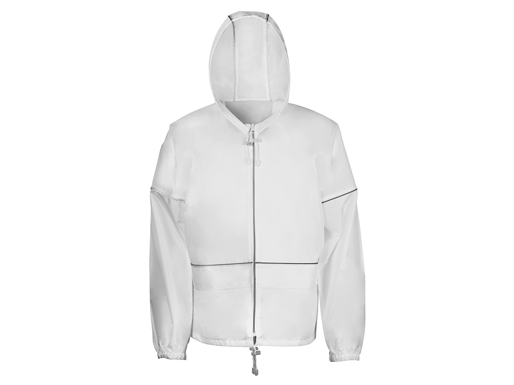 Короткий дождевик прямого силуэта с капюшоном и карманами. Вместительные накладные карманы защищены сверху клапанами, по верхней кромке которых вшит светоотражающий кант. Светоотражающие элементы также расположены на рукавах, капюшоне и молнии, что делает человека заметным даже в темное время суток.