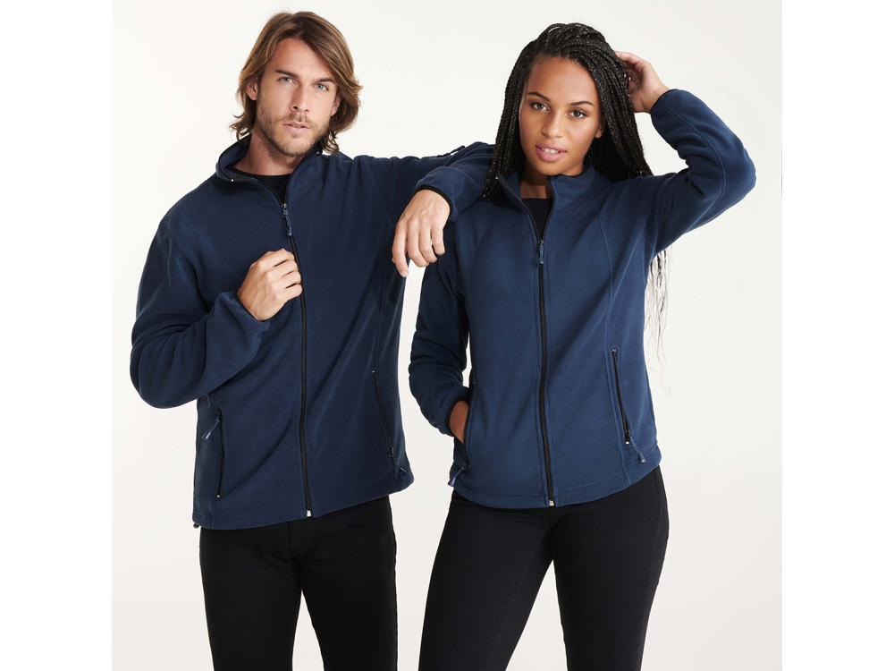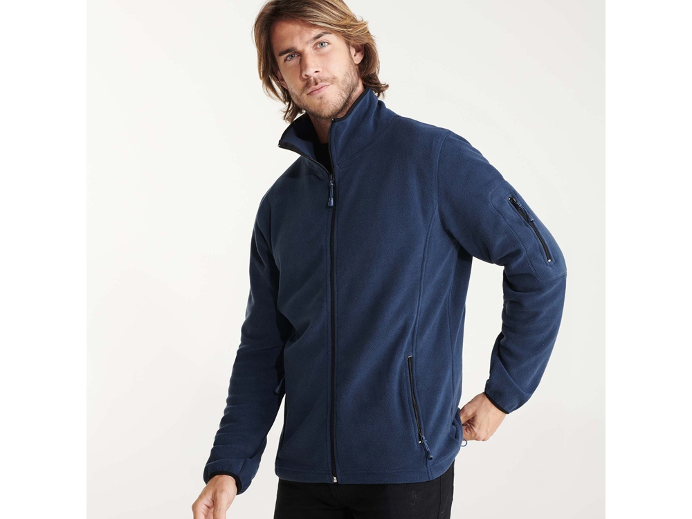Куртка из микрофлиса с высоким воротом. Контрастная центральная молния, боковые карманы на молнии, декоративная молния на левом рукаве, отделка резинкой по краю рукавов. Налокотники из основного материала.