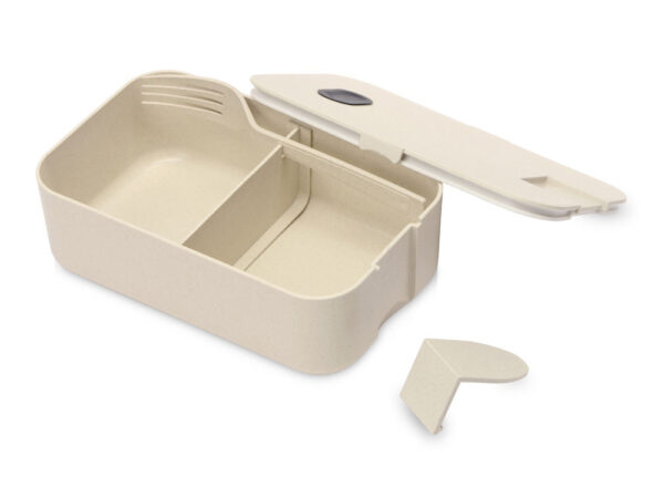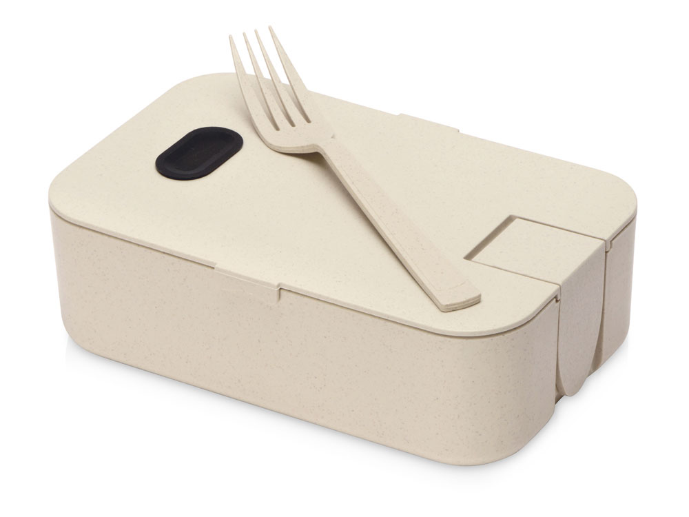 Внутри прочной пластиковой емкости находятся снимаемая перегородка и вилка. Крышка с клапаном препятствует выливанию и выпадению продуктов из бокса.