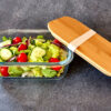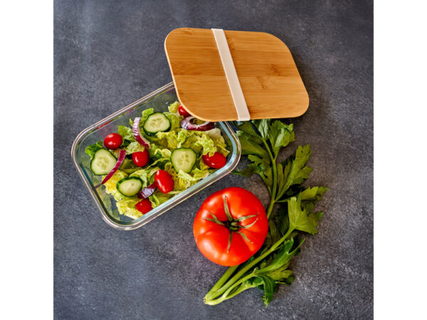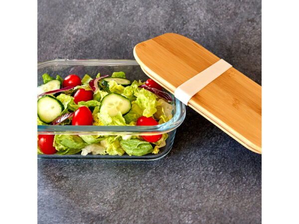 Ланч-бокс из боросиликатного стекла с бамбуковой крышкой и силиконовой лентой для закрытия.
