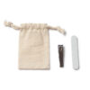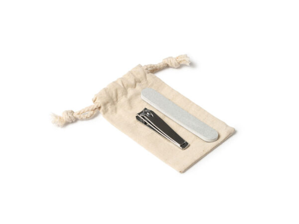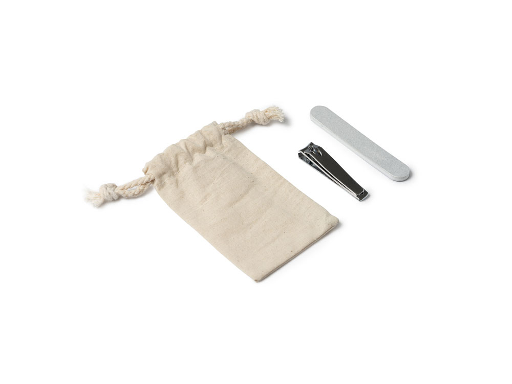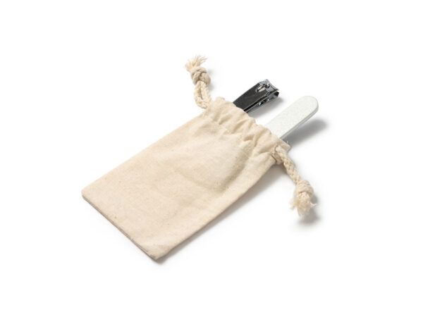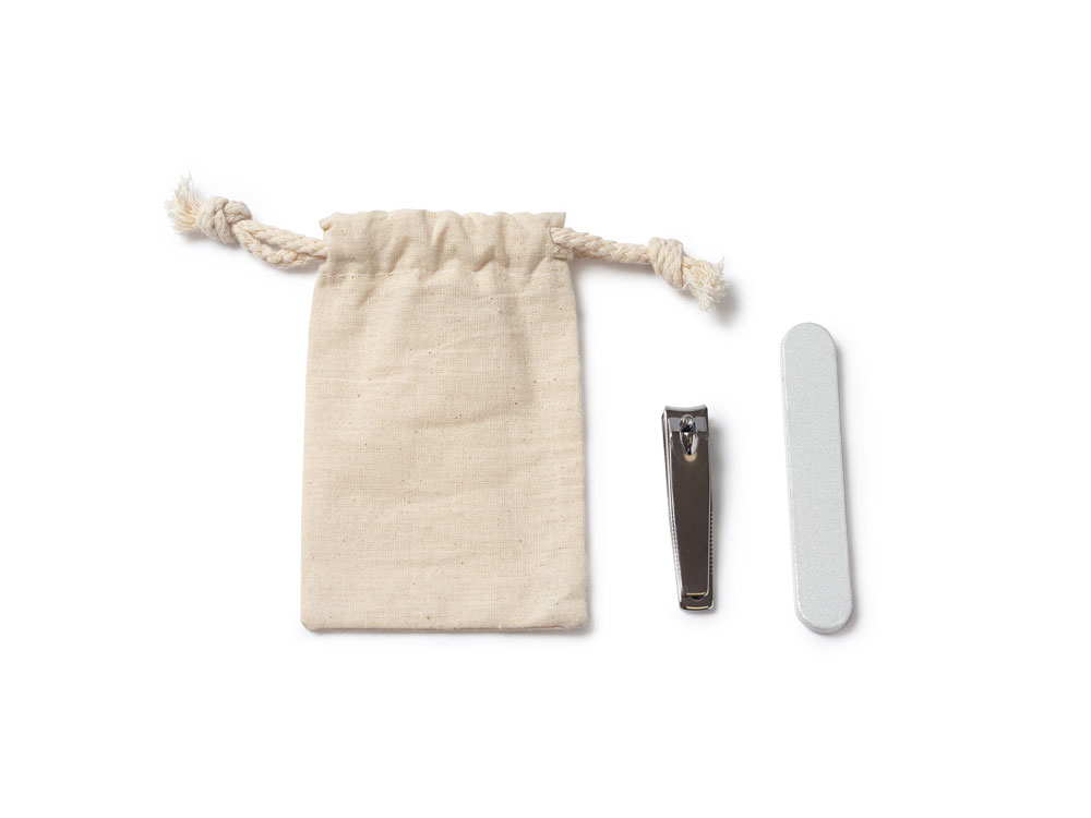 Маникюрный набор в хлопковом мешочке с завязками. В комплекте пилочка и кусачки для ногтей.