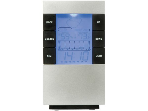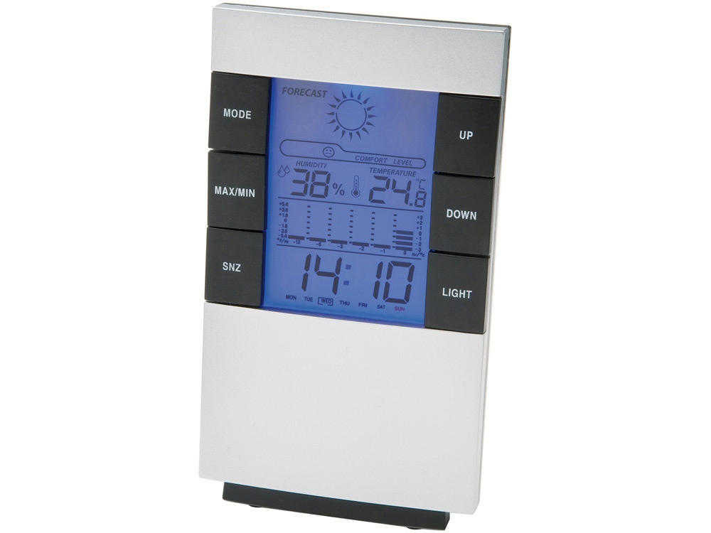 Настольная метеостанция с будильником показывает дату, время, день недели, уровень влажности и температуры в помещении. По желанию можно включить и выключить подсветку. Работает от 2 батареек размера AAA, в комплект не входят.