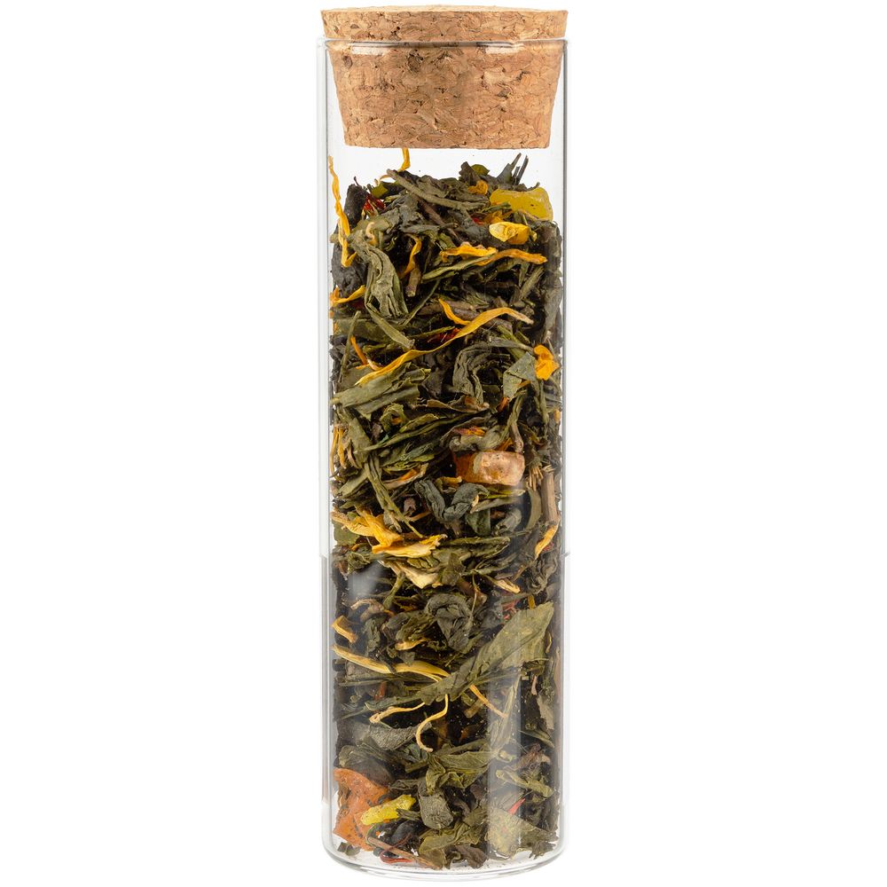 • чай зеленый «Восемь сокровищ Шаолиня» (состав: сенча, зеленый чай ганпаудер, папайя, лепестки сафлора, лепестки календулы, ароматизатор «клубника»), вес 25 г;