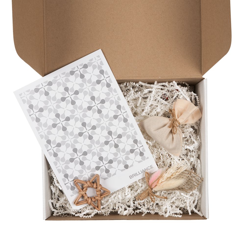 Коробка с наполнителем, шубером, открыткой и милыми украшениями Adorno — готовое решение для упаковки личного и корпоративного подарка.