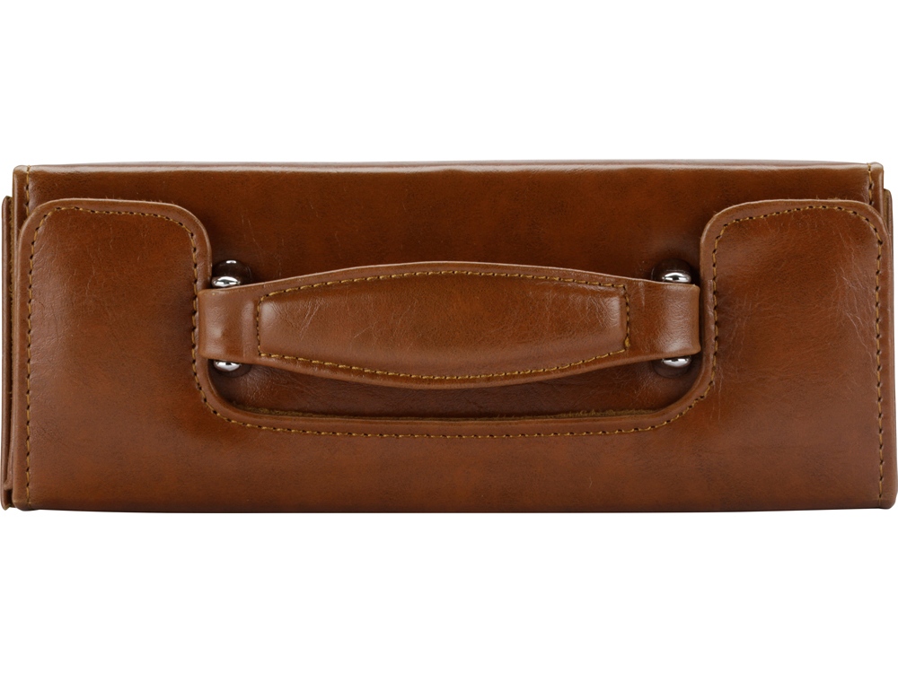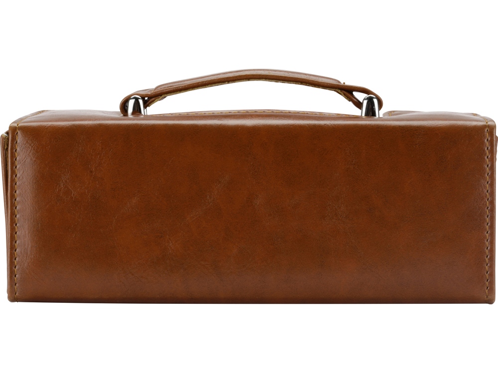 Настоящий сундучок из коричневого кожзама содержит целую кладезь полезных аксессуаров для чистки обуви. Набор не занимает много места при хранении и всегда готов прийти на помощь в поддержании чистоты вашей обуви. В набор входит 8 предметов. На футляр можно нанести логотип.
