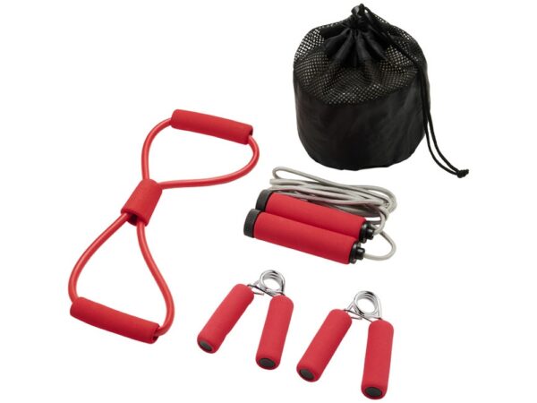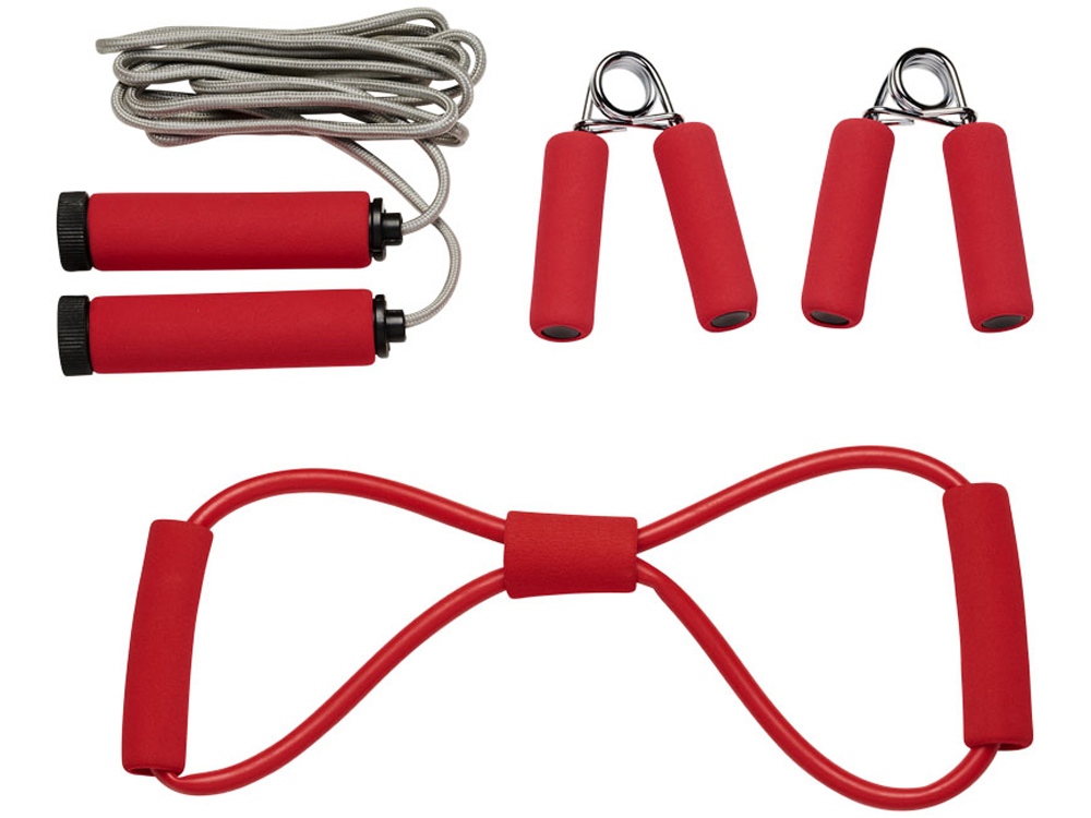 Набор для фитнеса «Dwayne» содержит весь спортивный инвентарь, необходимый для полноценной тренировки. Два кистевых эспандера, скакалка и грудной эспандер в соответствующем цветовом исполнении. Для удобной переноски поставляется в сетчатом мешочке, на котором можно сделать нанесение. Полиэстер.