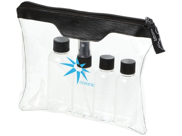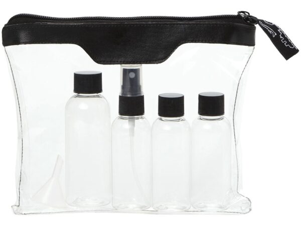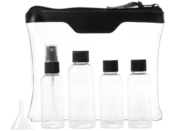 Одобренный дорожный набор бутылок для полетов Munich. Включает 2 бутылки по 50 мл, 1 бутылку на 90 мл и 1 пульверизатор. ПВХ.