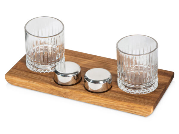 деревянная подставка 28,5 х 12,9 х 2,1 см, бокал 210 мл- 2 шт, шайба для виски d5 х 2,8 см- 2 шт, упаковочная коробка