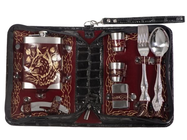 Оригинальный дорожный набор на 4 персоны в барсетке с удобным ремешком для переноски. Барсетка из искусственной кожи, отделка- натуральная кожа с художественным выжиганием.