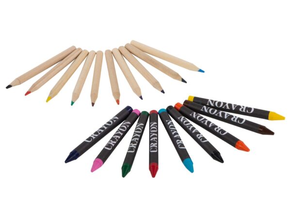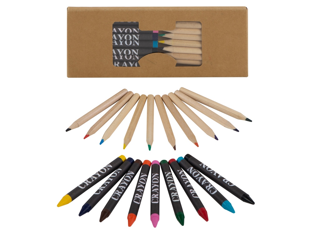Набор из 19 карандашей. 9 цветных восковых карандашей и 10 цветных карандашей в картонной коробке с пластиковым окошком.