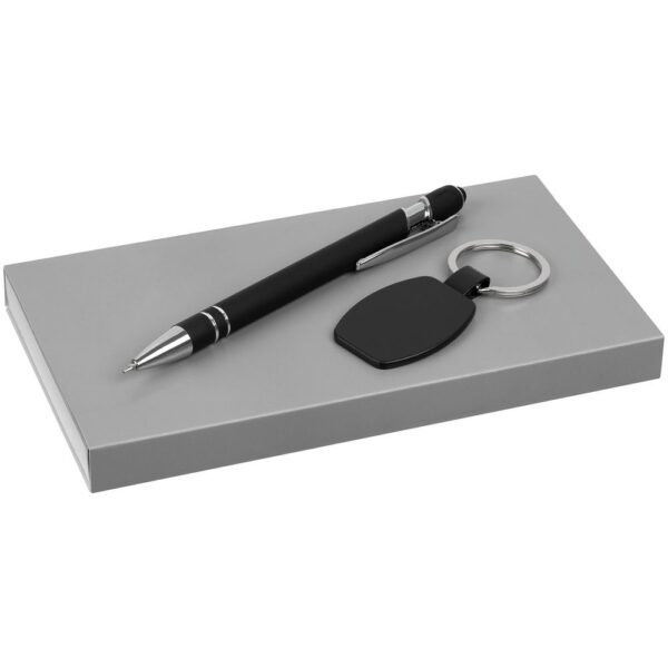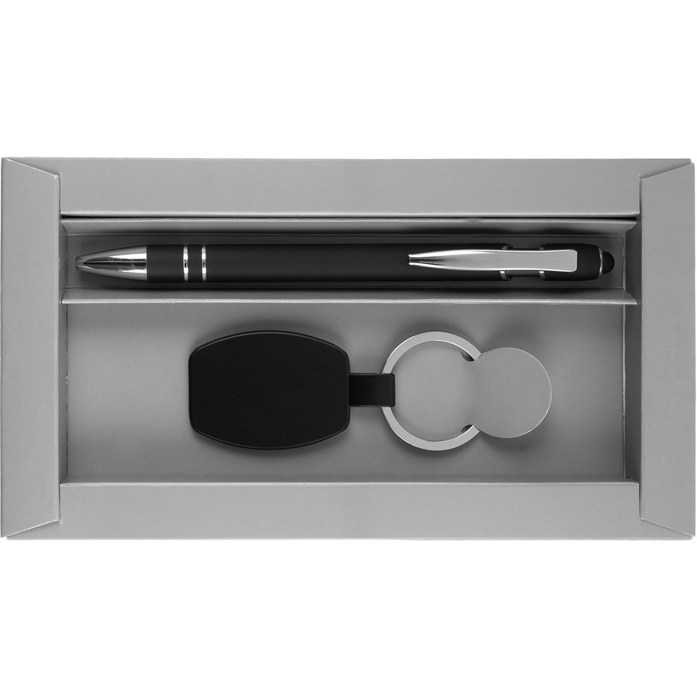 Стильное решение для простого делового подарка с эффектным оформлением: гравировка на брелке вскрывается серебристым, точно в тон хромированным деталям на ручке.