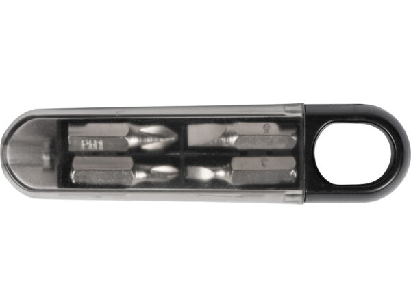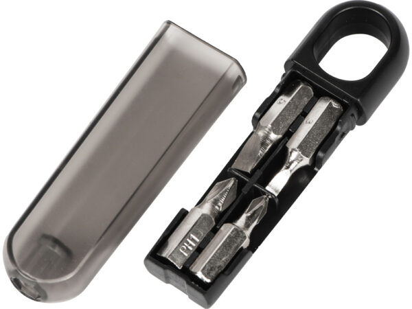 Набор отверток состоит из 4 бит (две крестовые, две поперечные разного размера), которые подсоединяются к ручке-кейсу. Благодаря прозрачной крышке все биты видны, даже когда кейс закрыт, что помогает держать их количество под контролем.